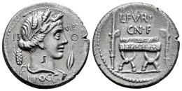 Furia. L. Furius Cn. f. Brocchus. Denario. 63 a.C. Roma. (Ffc-735). (Craw-414/1). (Tesorillo-Furia 4, mismo ejemplar). Anv.: Cabeza de Ceres coronada de espigas a derecha, delante grano de cebada, detrás una espiga,en el campo: III. VIR., debajo: BROCCHI. Rev.: Silla curul entre dos fasces con hachas, encima: L. FVRI. CN. F. Ag. 3,65 g. Marcas de banquero en anverso. Atractiva. MBC+/MBC. Est...120,00.