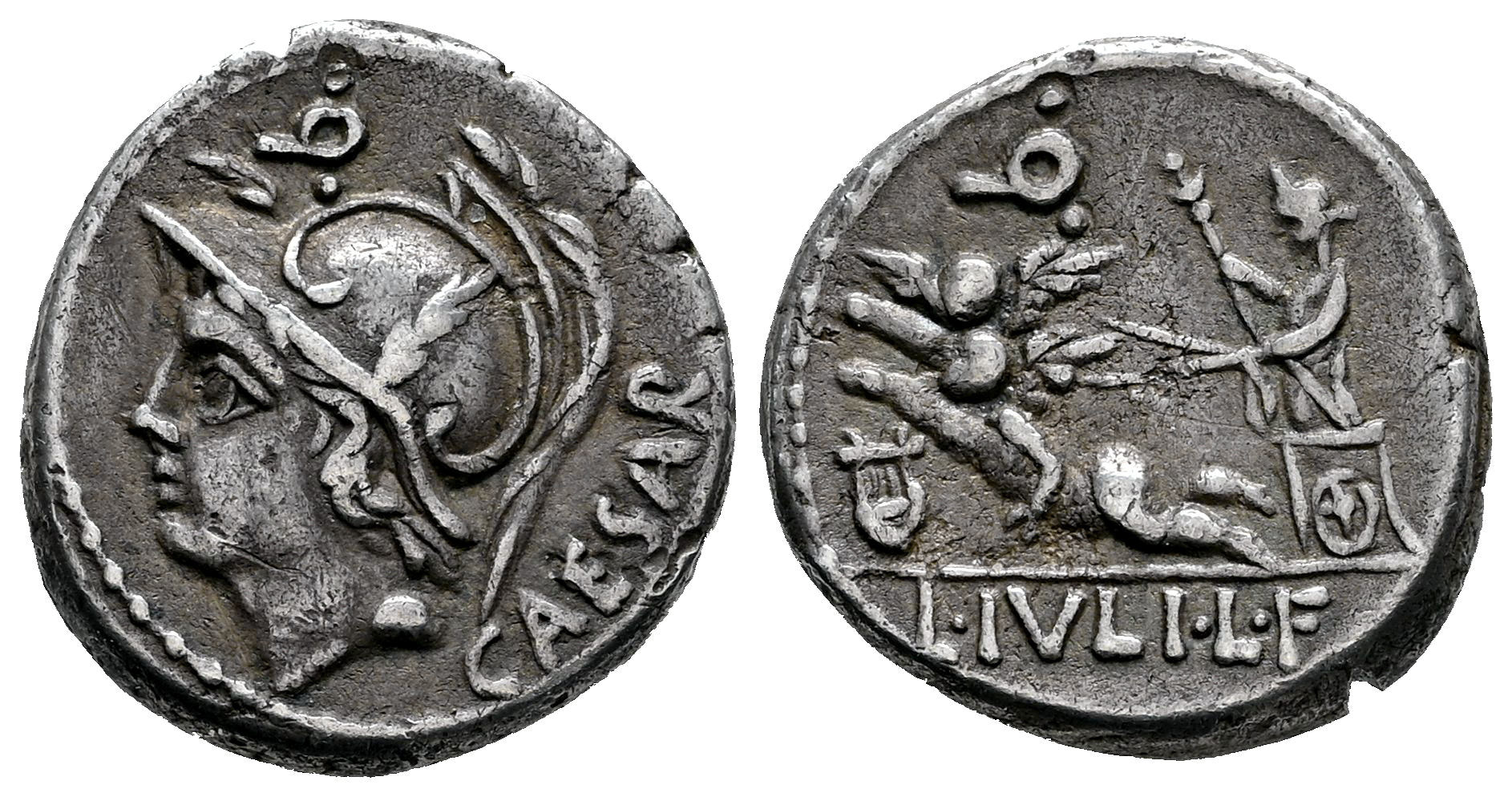 Julia. L. Julius L.f. Caesar. Denario. 103 a.C. Roma. (Ffc-764). (Craw-320/1). (Tesorillo-Julia 1, mismo ejemplar). Anv.: Cabeza de Marte a izquierda, encima: letra·q· , detrás: CAESAR. Rev.: Venus Genetrix en biga a izquierda, tirada por Amorcillos, debajo lira, encima: letra ·q·, en el exergo: L. IVLI L.F. Ag. 3,76 g. Ex Cayón (17/12/2020), lote 13. Conserva la etiqueta original. MBC. Est...150,00.