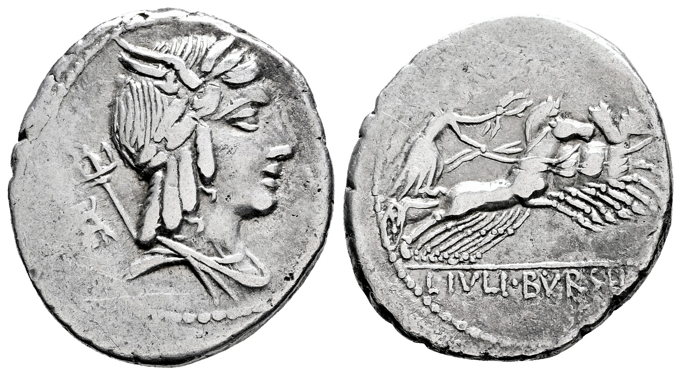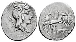 Julia. L. Julius Bursio. Denario. 85 a.C. Taller Auxiliar de Roma. (Ffc-767). (Craw-352/1a). (Tesorillo-Julia 2, mismo ejemplar). Anv.: Cabeza alada y laureada de Apolo Vejovis a derecha, detrás: tridente y símbolo. Rev.: Victoria con corona en cuadriga a derecha, en el exergo: L. IVLI. BVRSIO. Ag. 3,59 g. Raro símbolo. MBC+. Est...100,00.