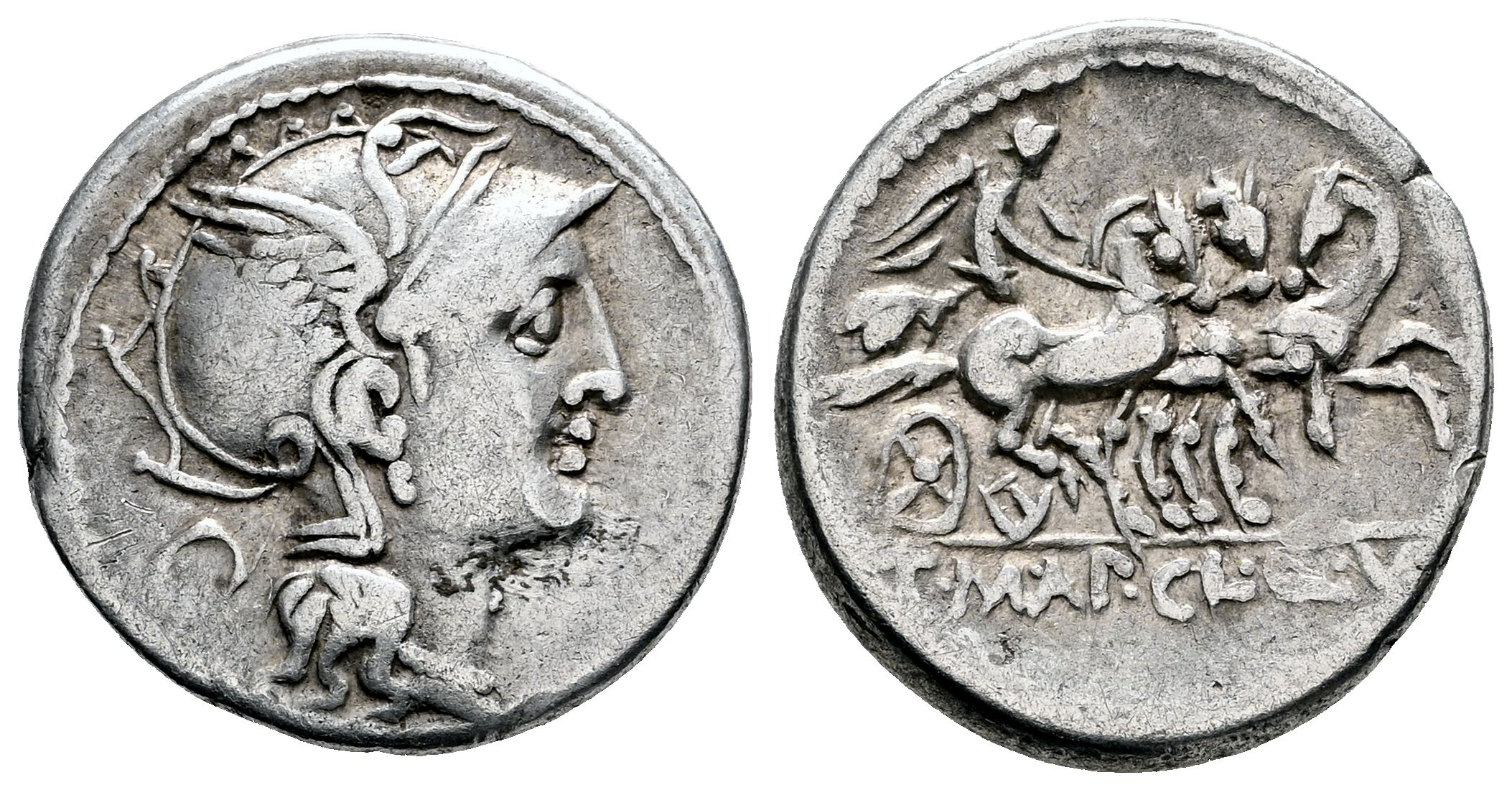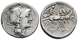 Mallia. T. Mallius Mancinus Appius. Denario. 111-110 a.C. Roma. (Ffc-834). (Craw-299/1b). (Tesorillo-Mallia 3, mismo ejemplar). Anv.: Cabeza de Roma a derecha, detrás: circulo. Rev.: Victoria en triga a derecha, en el exergo: T. MAL. AP. CL. Q. VR., (MAL y VR entrelazadas). Ag. 3,80 g. Ex Ancient Delights, actualmente Mayor 25. Convención de Madrid (Julio 2004). MBC. Est...90,00.