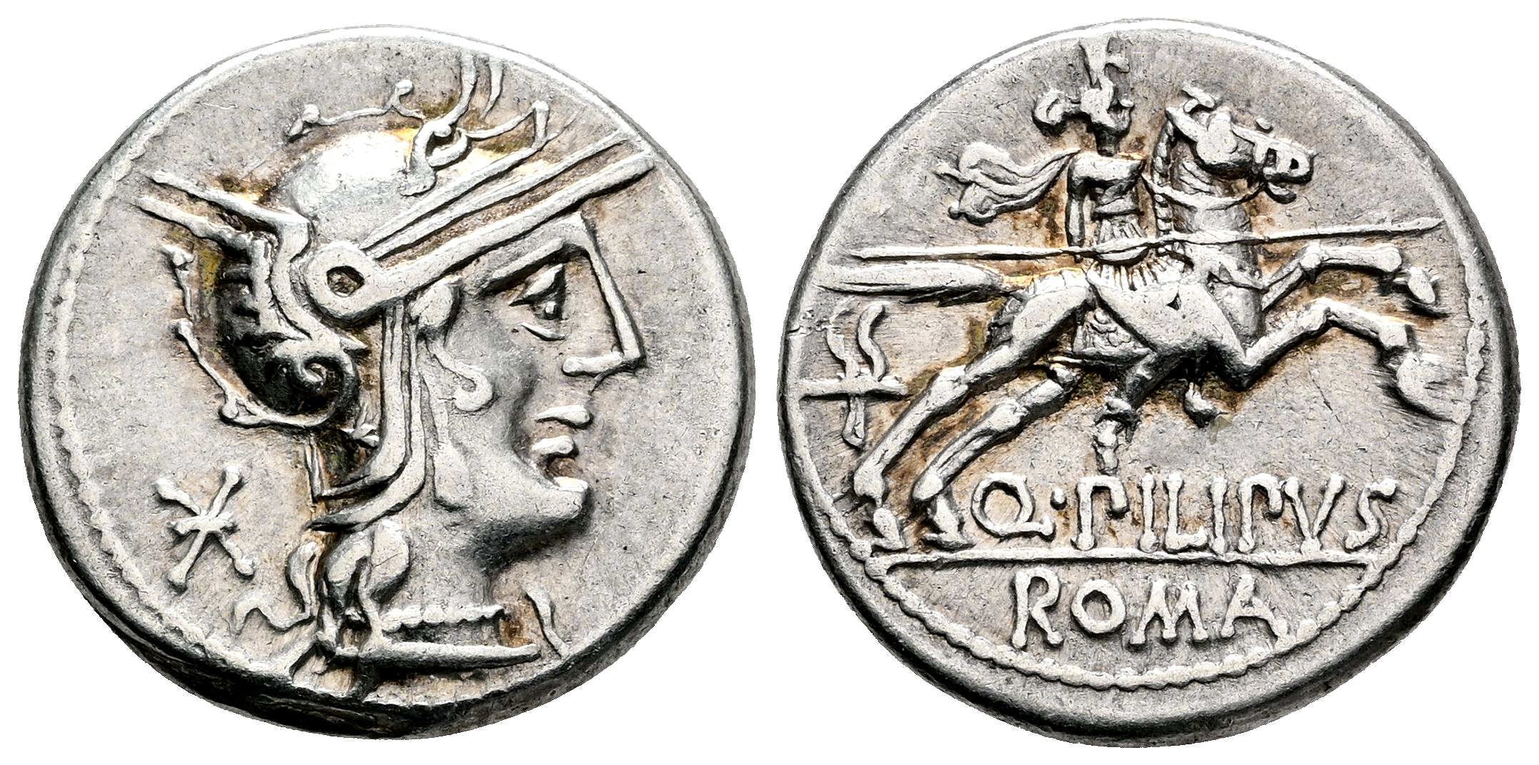 Marcia. Q. Marcius Philipus. Denario. 129 a.C. Roma. (Ffc-849). (Craw-259/1). (Cal-Marcia 4, mismo ejemplar). Anv.: Cabeza de Roma a derecha, detrás: X. Rev.: Jinete con lanza a derecha detrás: yelmo macedónico, debajo: Q. PILIPVS., en el exergo: ROMA. Ag. 3,91 g. MBC+. Est...120,00.