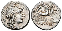 Marcia. Q. Marcius, C. Fabius, L.Roscius. Denario. 118-117 a.C. Norte de Italia. (Ffc-853). (Craw-283/1a). (Tesorillo-Marcia 5, mismo ejemplar). Anv.: Cabeza de Roma a derecha, detrás: X. Rev.: Victoria en cuadriga a derecha, con corona, debajo: ROMA., en el exergo: Q. MAR. C.F.L.R., (MAR entrelazadas). Ag. 3,89 g. Ligero tono. Bella. EBC-/MBC+. Est...140,00.