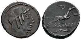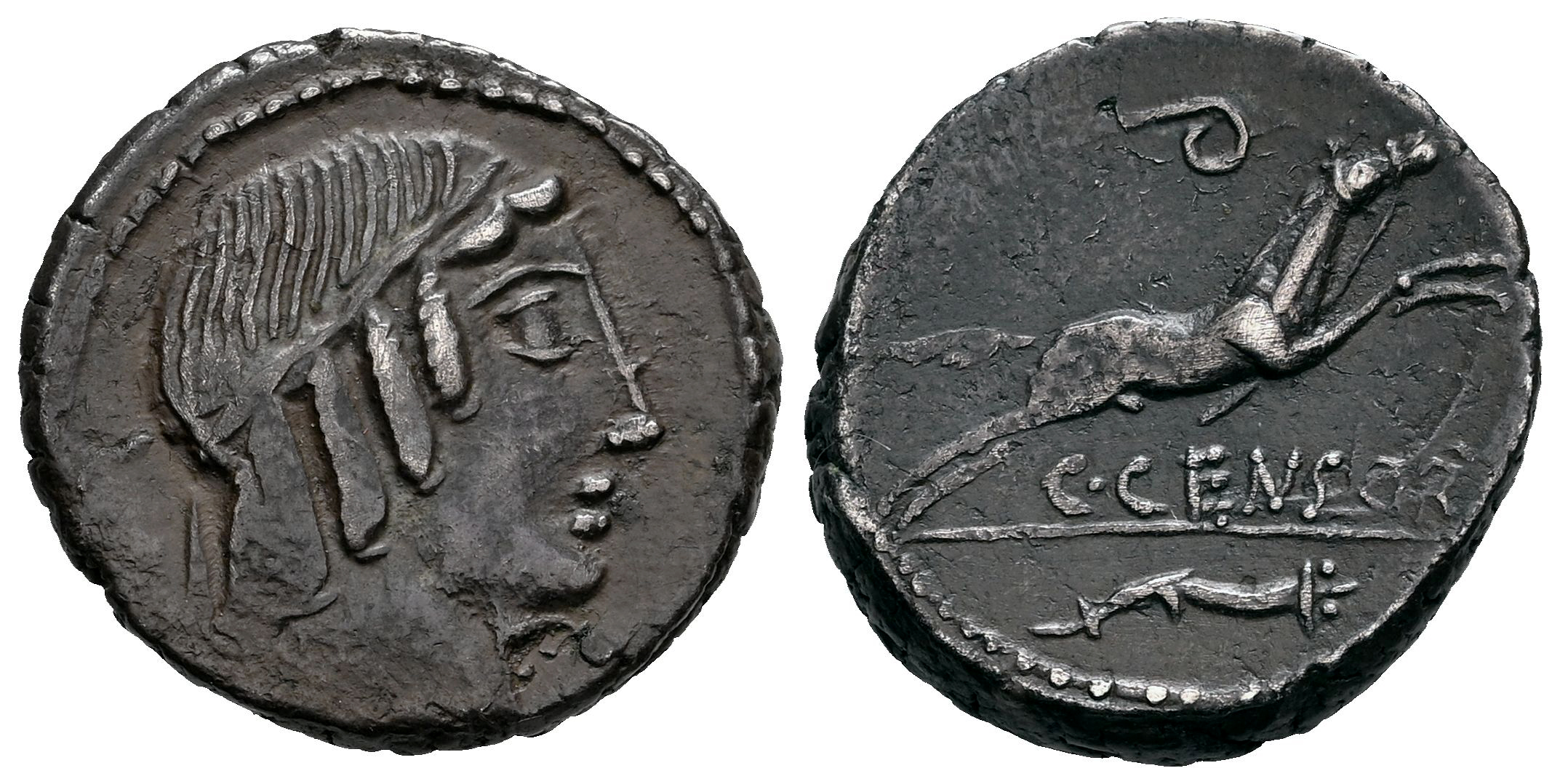 Marcia. Caius Marcius Censorinus. Denario. 88 a.C. Acuñación incierta. (Ffc-870). (Craw-346/2b). (Tesorillo-Marcia 8, mismo ejemplar). Anv.: Cabeza diademada de Apolo a derecha. Rev.: Caballo a derecha, encima: letra o Lituus , en el exergo: cornucopia, debajo: C. CENSORI. Ag. 3,98 g. Pátina original. Rara. MBC+. Est...120,00.