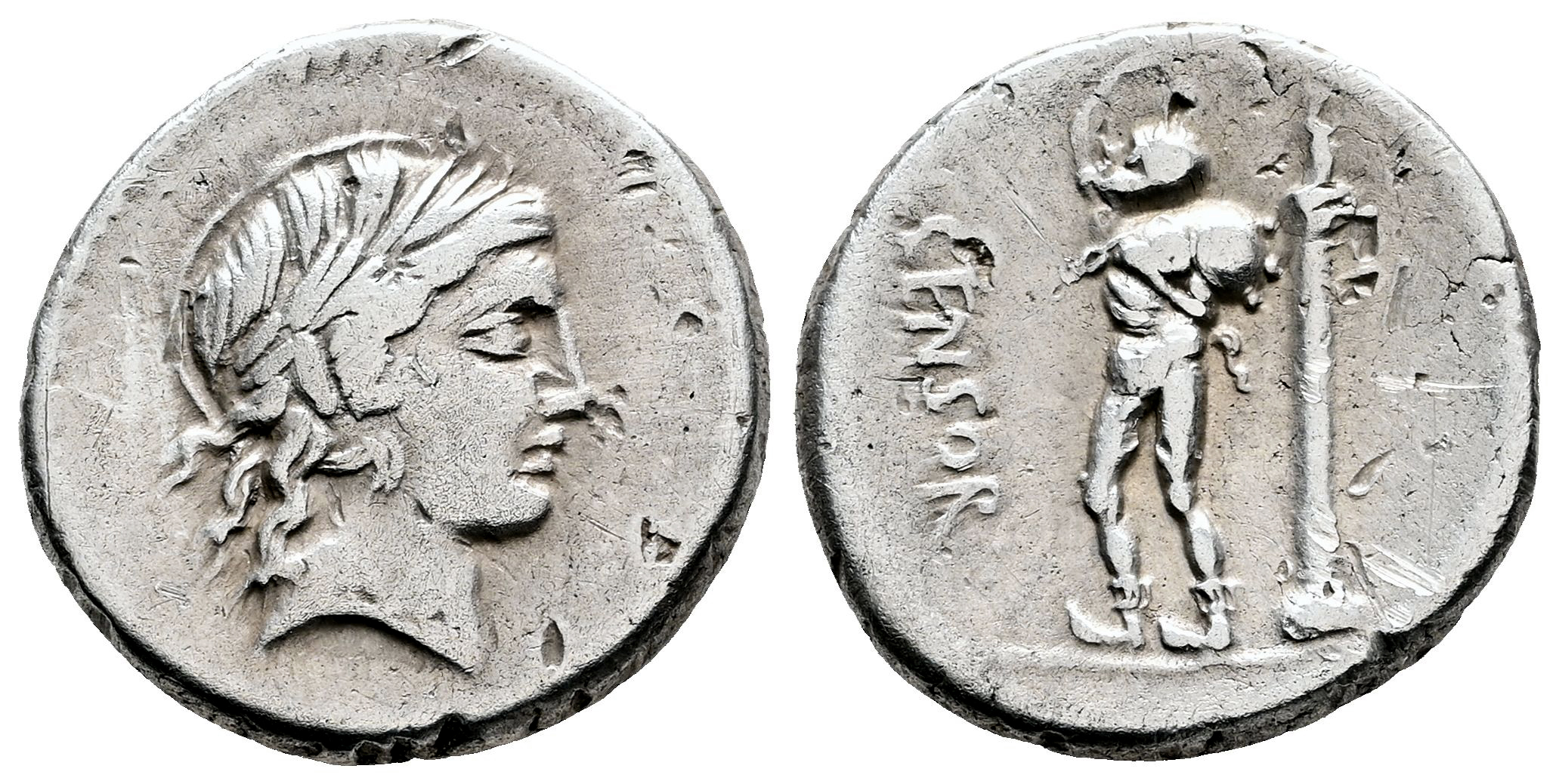 Marcia. L. Marcius Censorinus. Denario. 88 a.C. Roma. (Ffc-888). (Craw-363/1d). (Tesorillo-Marcia 9, mismo ejemplar). Anv.: Cabeza laureada de Apolo a derecha. Rev.: Sátiro Marsyas, de pie a izquierda, en el campo a derecha, columna surmontada por estatua, a izquierda, en vertical: L. CENSOR. Ag. 3,88 g. Marquitas. MBC. Est...100,00.