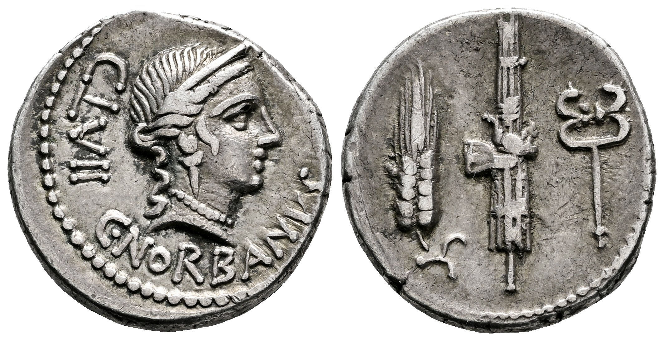 Norbana. C. Norbanus. Denario. 83 a.C. Roma. (Ffc-943). (Craw-357/1b). (Tesorillo-Norbana 1, mismo ejemplar). Anv.: Cabeza diademada de Venus a derecha, detrás: número, C. NORBANVS. Rev.: Fasces con hacha, entre espiga y caduceo. Ag. 3,97 g. Ex Cayón (11/12 Diciembre 2006), lote 242. Conserva la etiqueta original. MBC+. Est...140,00.