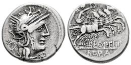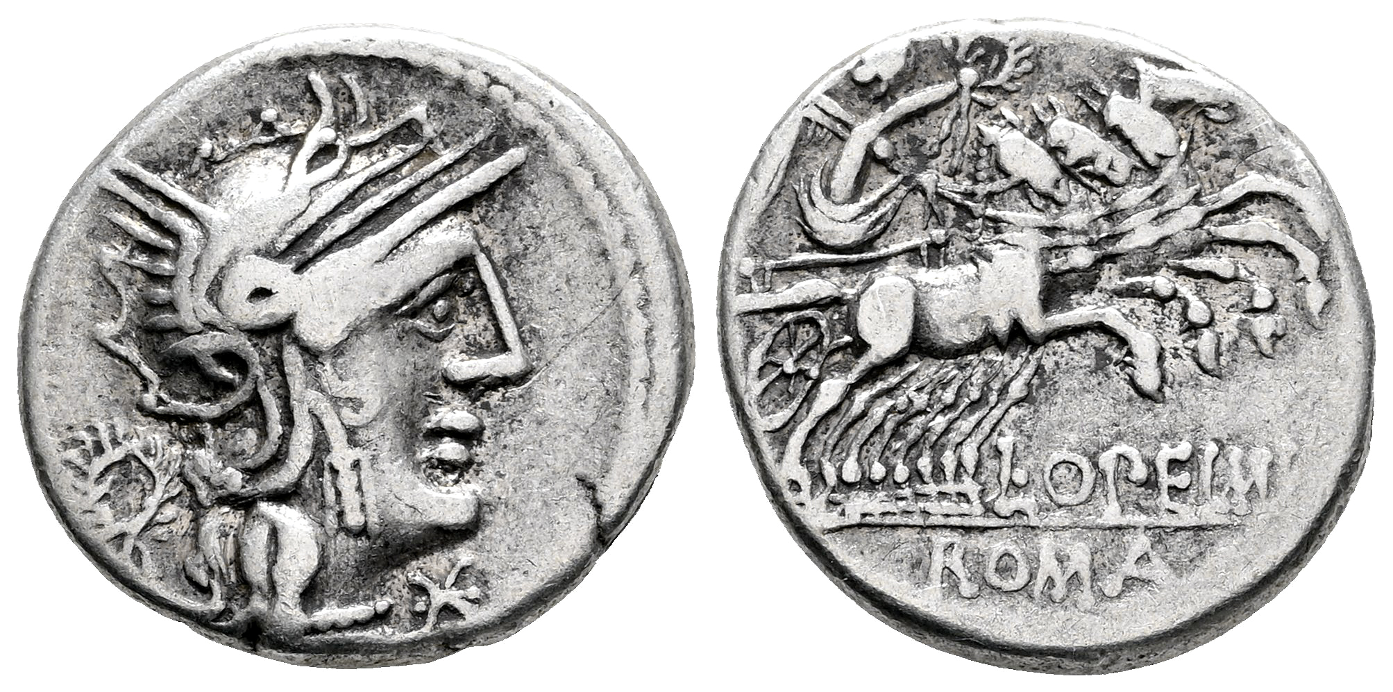 Opimia. L. Opeimius. Denario. 131 a.C. Roma. (Ffc-949). (Craw-253/1). (Tesorillo-Opeimia 1, mismo ejemplar). Anv.: Cabeza de Roma a derecha delante: X, detrás corona. Rev.: Victoria con corona en cuadriga a derecha, debajo: L. OPEIML ,en el exergo: ROMA. Ag. 3,86 g. Ex J. Vico (Marzo 2002), lote 1278. MBC. Est...90,00.