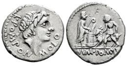 Pomponia. L. Pomponius Molo. Denario. 97 a.C. Taller Auxiliar de Roma. (Ffc-1030). (Craw-334/1). (Tesorillo-Pomponia 2, mismo ejemplar). Anv.: Cabeza laureada de Apolo a derecha, L. POMPON. MOLO. Rev.: Numa con lituo prestándose a sacrificar un macho cabrío, que lleva un victimario, en el exergo: NVMA. POMPIL. (MA entrelazadas). Ag. 3,78 g. Marca de banquero en reverso. MBC+. Est...200,00.