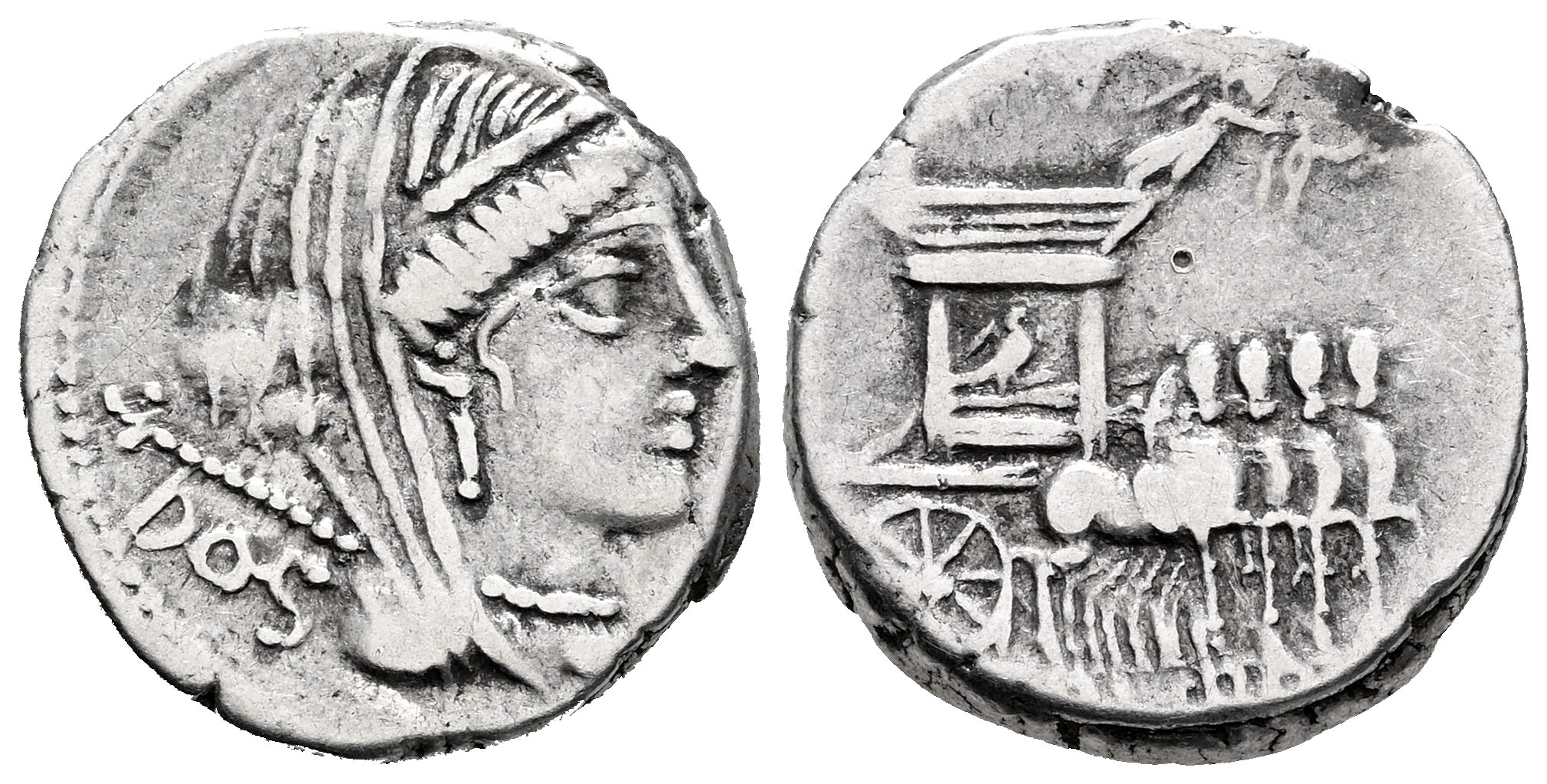 Rubria. L. Rubrius Dossenus. Denario. 87 a.C. Roma. (Ffc-1092). (Craw-348/2). (Tesorillo-Rubria 2, mismo ejemplar). Anv.: Cabeza velada de Juno a derecha,detrás: DOS. Rev.: Carro triunfal a derecha, encima Victoria volando con una corona, en el exergo: L. RVBRI. Ag. 3,64 g. Ex J. Vico (Junio 2002), lote 1281. MBC. Est...90,00.