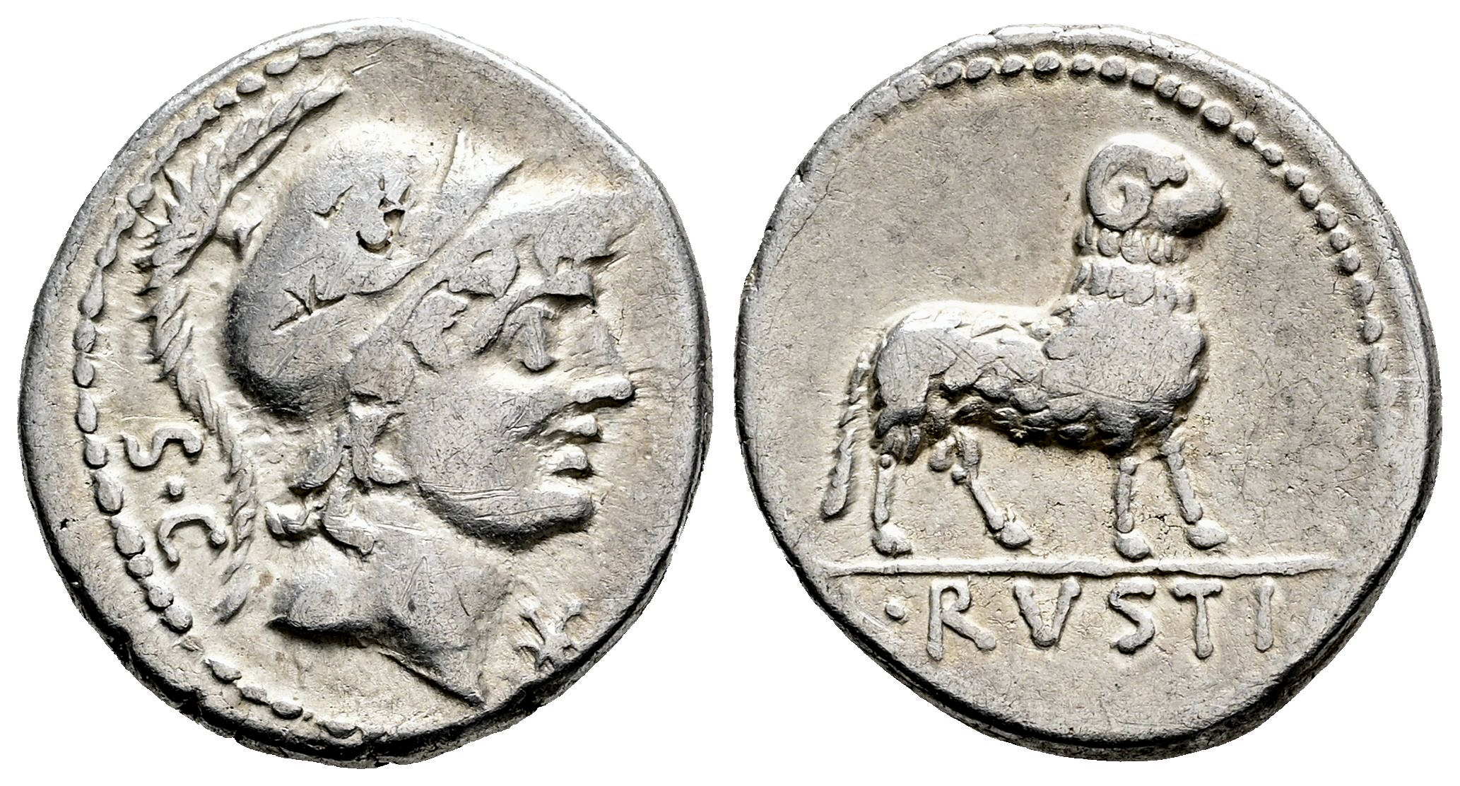 Rustia. L. Rustius. Denario. 76 a.C. Roma. (Ffc-1094). (Craw-389/1). (Tesorillo-Rustia 1, mismo ejemplar). Anv.: Cabeza de Marte a derecha, delante: X, detrás: S.C. Rev.: Macho cabrío a derecha, en el exergo: L. RVSTI. Ag. 3,83 g. Marca de banquero en anverso. Ex AncientCoinArt.com (Septiembre 2003), lote 2934. MBC+/MBC. Est...120,00.