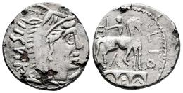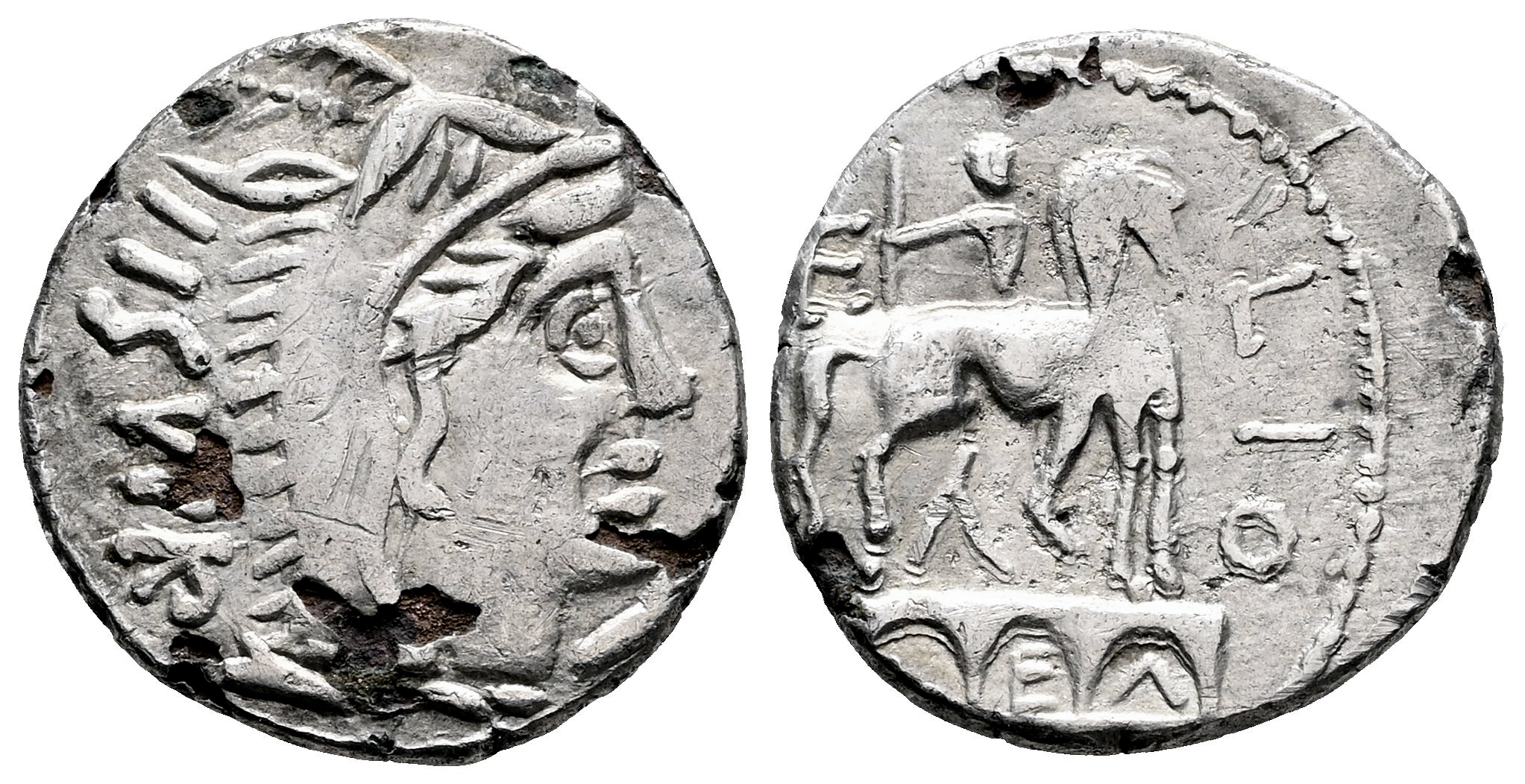 Thoria/Aemilia. Bajo Danubio. Geto-Dacios. Denario forrado. Siglo I a.C. (Craw-316/1, 291/1). (Tesorillo-Thoria 3, mismo ejemplar). Anv.: Cabeza de Juno Sospita a derecha, cubierta con piel de cabra, detrás: I I S W (K/R). Rev.: Estatua ecuestre a derecha sobre tres arcos: dentro de ellos ΕΛ,en círculo. ... E ILIO. Ae/Ag. 2,59 g. Acuñación híbrida que imita los denarios romanos en circulación. Presenta el anverso de un Denario de la familia Thoria y el reverso de Aemilia, con un estilo característico de las imitaciones de los pueblos indoeuropeos. Rara. MBC. Est...120,00.
