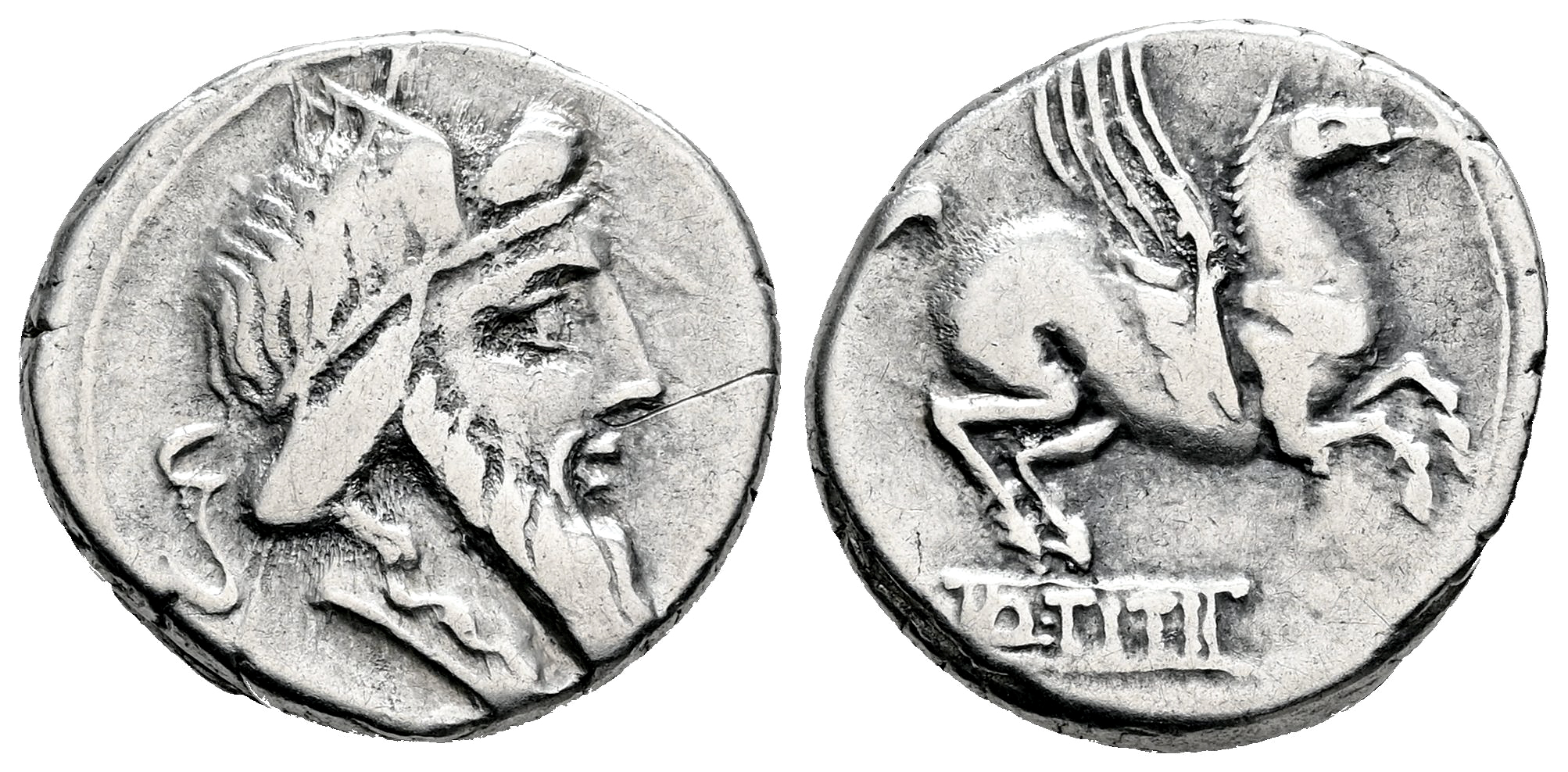 Titia. Q. Titius. Denario. 90 a.C. Italia Central. (Ffc-1142). (Craw-341/1). (Tesorillo-Titia 2, mismo ejemplar). Anv.: Cabeza del dios Mutinus Titinus a derecha. Rev.: Pegaso a derecha, debajo: Q. TITI., dentro de una tablilla. Ag. 4,02 g. MBC-/MBC. Est...90,00.