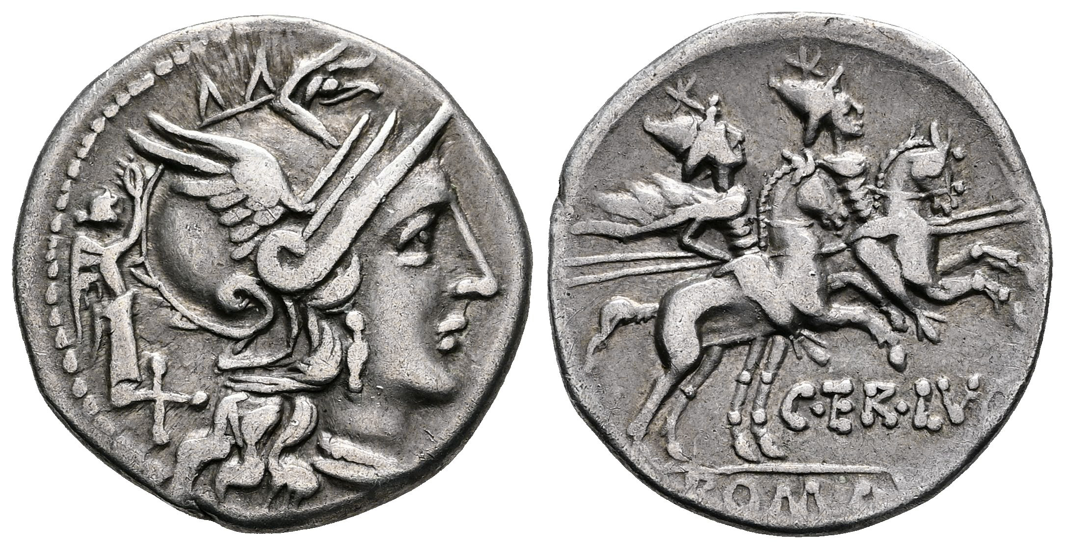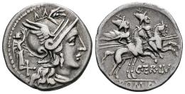 Terentia. C. Terentius Lucanus. Denario. 147 a.C. Roma. (Ffc-1146). (Craw-217/1). (Tesorillo-Terentia 1, mismo ejemplar). Anv.: Cabeza de Roma a derecha, detrás: Victoria coronándola, y X. Rev.: Los Dioscuros a caballo a derecha, encima: estrellas, debajo: C. TERLVC.,(TE entrelazadas), en el exergo: ROMA, en tablilla. Ag. 3,29 g. Ex J. Vico 110 (09/03/2006), lote 2251. Conserva la etiqueta original. MBC+/MBC. Est...120,00.