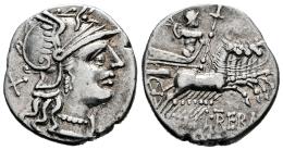 Trebania. L. Trebanius. Denario. 135 a.C. Acuñación incierta. (Ffc-1160). (Craw-241/1a). (Tesorillo-Trebania 1, mismo ejemplar). Anv.: Cabeza de Roma a derecha, detrás: X. Rev.: Júpiter en cuadriga a derecha con cetro y haz de rayos,debajo: L. TREBANl., (TR y AN entrelazadas), en el exergo: ROMA. Ag. 3,58 g. Ex J. Vico 109 (10/11/2005), lote 454. Conserva la etiqueta original. MBC+. Est...120,00.