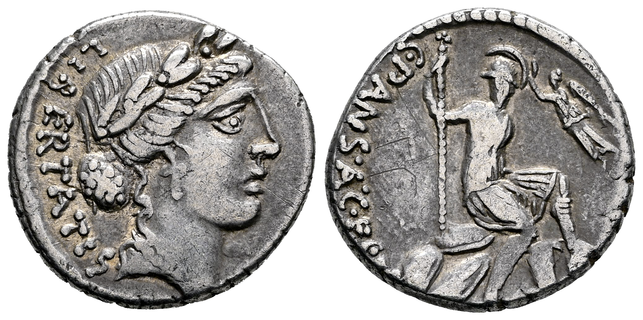 Vibia. C. Vibius C.f.C.n. Pansa. Denario. 48 a.C. Roma. (Ffc-1218). (Craw-449/4). (Tesorillo-Vibia 3, mismo ejemplar). Anv.: Cabeza laureada de la Libertad a derecha, el cabello anudado con una joya,detrás: LIBERTATIS. Rev.: Roma sentada a derecha, sobre un montón de escudos, cetro en su mano derecha, enfrente Victoria volando y coronándola,detrás: PANSA. C. F. C. N. Ag. 3,58 g. Ex AncientCoinArt.com (Enero 2004), lote 1033. Conserva la etiqueta original. MBC+/MBC. Est...120,00.
