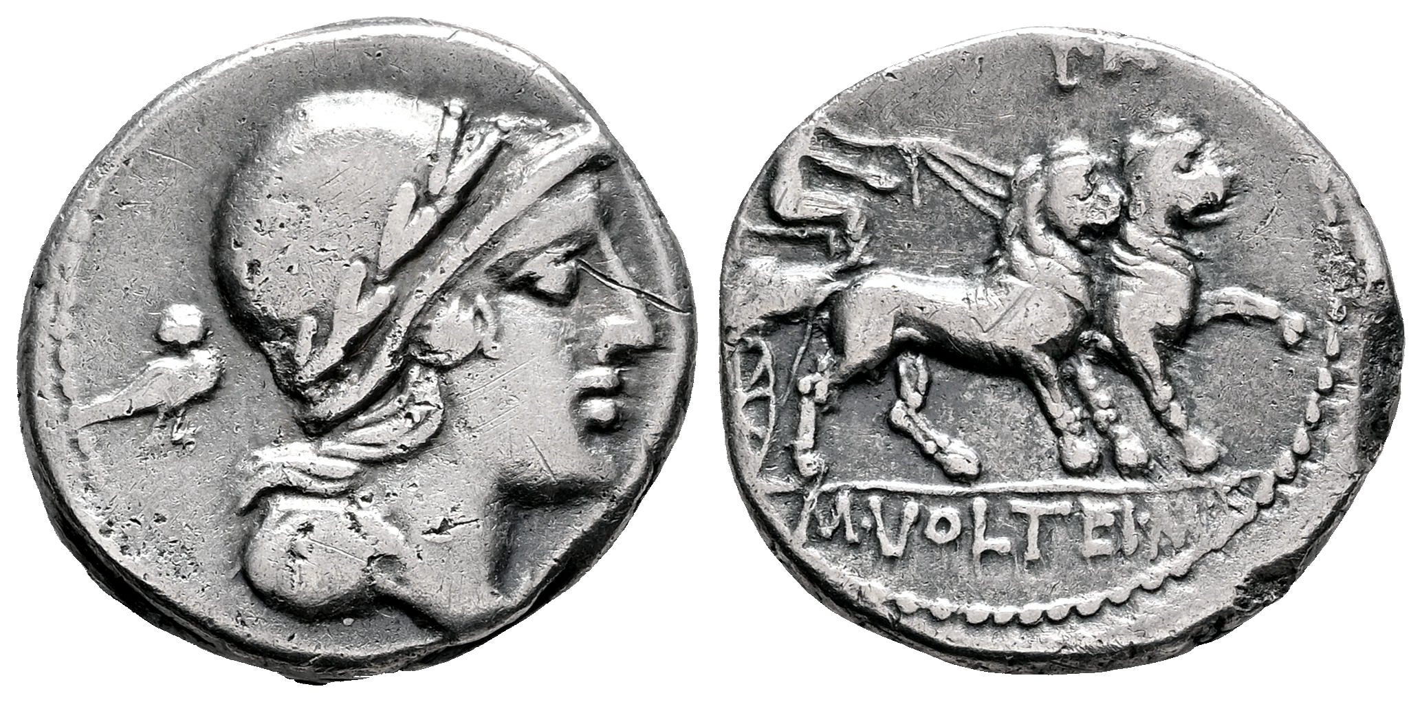 Volteia. M. Volteius M.f. Denario. 78 a.C. Roma. (Ffc-1232). (Craw-385/4). (Tesorillo-Volteia 3, mismo ejemplar). Anv.: Busto con yelmo laureado de Attis o Coribas a derecha, detrás: ¿lechuza?. Rev.: Cibeles en biga arrastrada por leones a derecha, encima: ¿PR?, en el exergo: M. VOLTEI M. F. Ag. 3,58 g. Rayitas. Ex J. Vico 107 (03/03/2005), lote 170. Conserva la etiqueta original. MBC. Est...85,00.