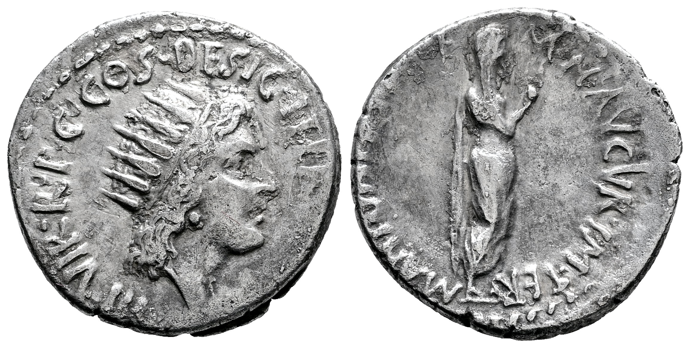 Marco Antonio. Denario. 38 a.C. Ceca volante. (Ffc-19). (Craw-533/2). (Tesorillo-Antonia 4, mismo ejemplar). Anv.: Cabeza radiada del Sol a derecha, III. VIR. R.P.C. COS. DESIG. ITER. ET. TERT. Rev.: Marco Antonio velado de pie a derecha, con lituo, M. ANTONIVS. M.F.M.N. AVGVR. IMP. TER., (MP entrelazadas). Ag. 3,51 g. Ex Ancient Delights, actualmente Mayor 25. (Junio 2002). MBC-/MBC. Est...200,00.