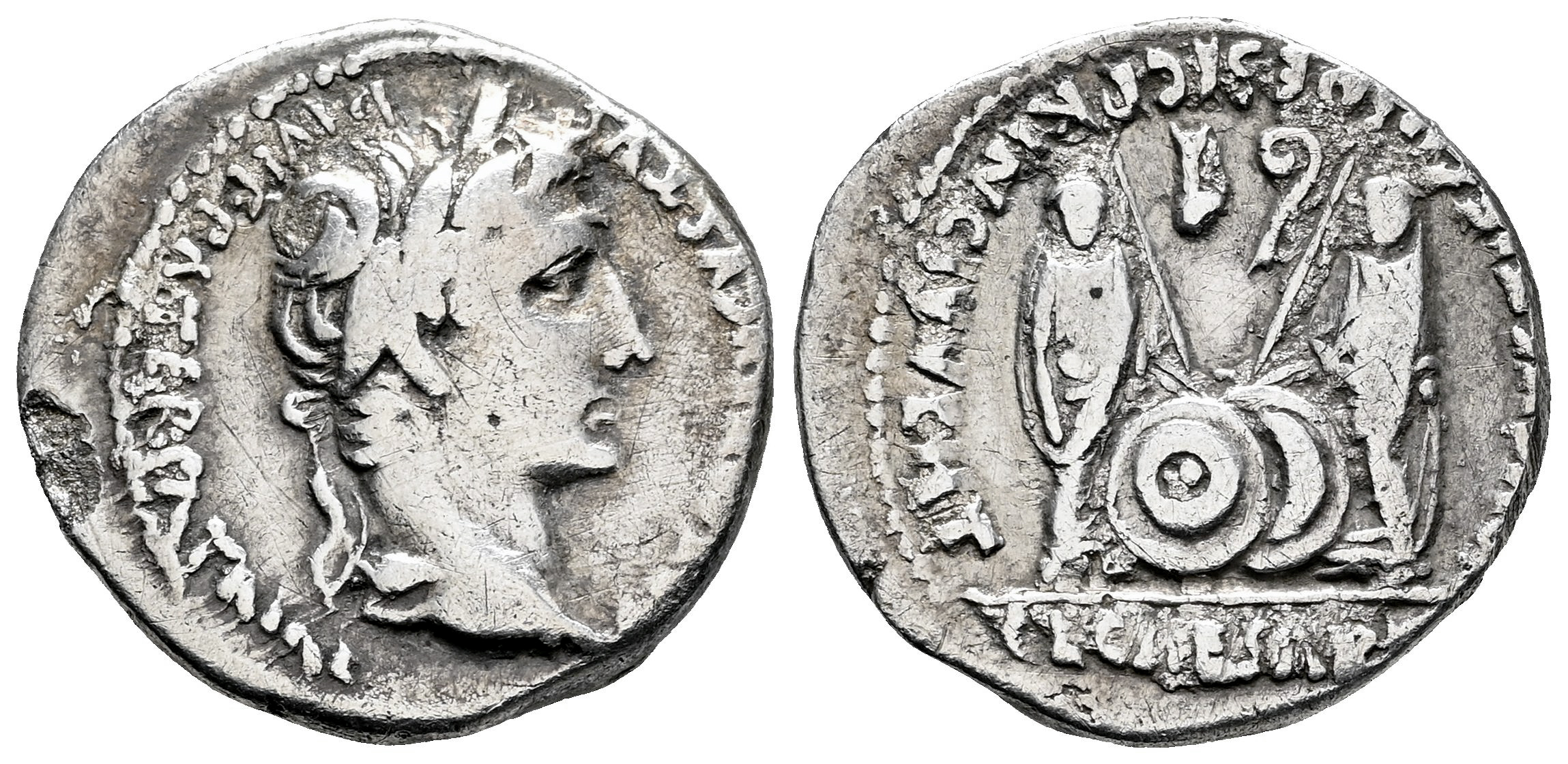 Augusto. Denario. 7-6 a.C. Lugdunum. (Ric-I 207). (Bmcre-519ff). (Tesorillo-Augusto 5, mismo ejemplar). Anv.: (CAESAR A)VGVSTVS DIVI F PATER PATRIAE. Cabeza laureada a derecha. Rev.: AVGVSTI F COS DESIG PRINC IVVENT. Cayo y Lucio César en pie de frente, apoyando las manos sobre escudos colocados entre ellos, con lanza detrás de cada escudo; arriba, a la izquierda, simpulum a derecha y, a derecha lituus hacia izquierda; C L CAESAR(ES) en exergo. Ag. 3,21 g. MBC-/MBC. Est...140,00.