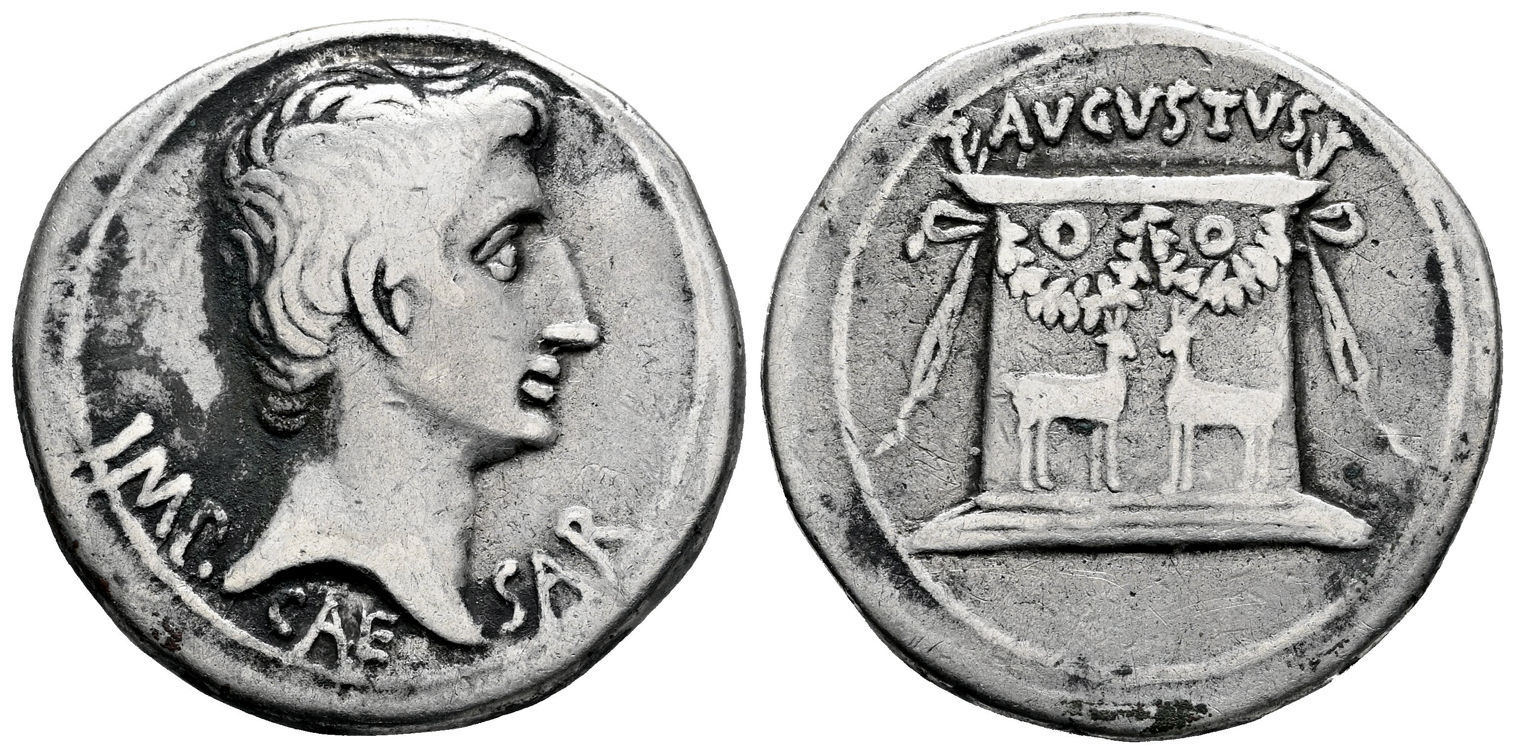 Augusto. Cistóforo. 25-20 a.C. Epheso. Ionia. (Ric-I 482). (Bmcre-694/5 = East 262/3). (Tesorillo-Augusto 1, mismo ejemplar). Anv.: IMP•CAESAR. Cabeza desnuda a la derecha. Rev.: Altar enguirnaldado y con cintas, decorado con ciervos en pie uno frente al otro; AVGVSTVS arriba. Ag. 11,56 g. Ex J. Cayón, compra directa durante una Convención de Madrid (Septiembre 2005). MBC-. Est...250,00.