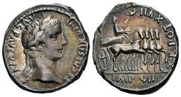 Tiberio. Denario. 15-16 d.C. Lugdunum. (Ric-I 4). (Bmcre--). (Tesorillo-Tiberio 3, mismo ejemplar). Anv.: TI CAESAR DIVI AVG F AVGVSTVS. Cabeza laureada a la derecha. Rev.: TR POT XVII. Tiberio, laureado y con capa, en pie en cuadriga lenta a la derecha, sosteniendo una rama de laurel y un cetro con punta de águila; las cabezas de los caballos están todas giradas a la derecha, IMP VII en exergo. Ag. 3,83 g. Siave pátina con ligero tono. Ex Soler & Llach 1072 (03/07/2012), lote 2359 . MBC/MBC+. Est...400,00.