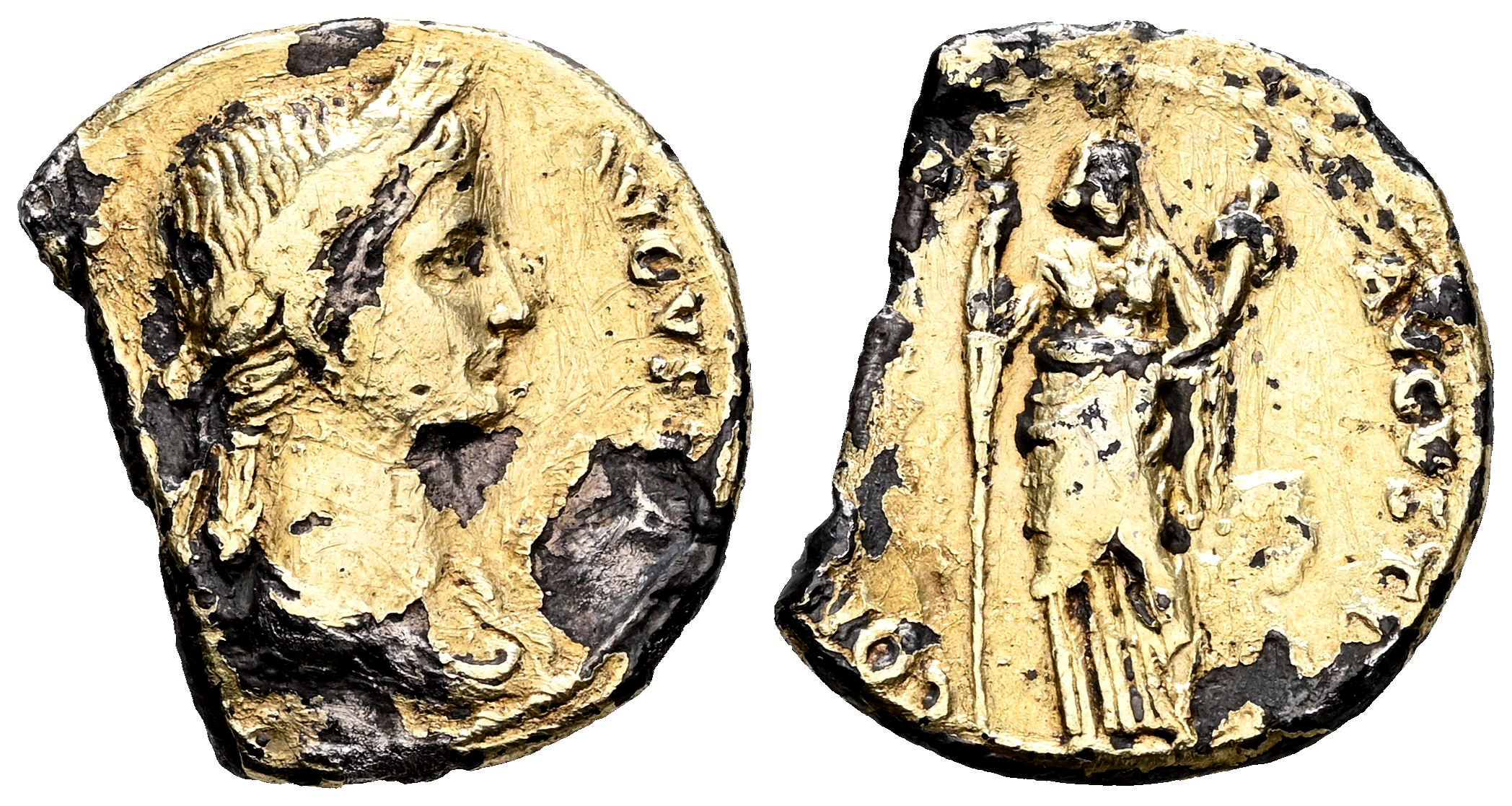 Antonia. Áureo forrado. 41-45 d.C. Roma. (Ric-I 65). (Bmcre-109). (Tesorillo-Antonia 1, mismo ejemplar). Anv.: (ANTONIA) AVGVSTA. Busto drapeado a la derecha, con corona de espigas. Rev.: CON(STANTIAE) AVGVSTI. Antonia en pie mirando de frente, sosteniendo una antorcha larga y una cornucopia. Ag/Au. 3,19 g. Rara. Ejemplar publicado en la revista ARSE (1985. pp. 519-520) por D. Valentín Cabrera Fombuena. Ex J. Vico 108 (09/06/2005), lote 315. Conserva la etiqueta original. MBC-. Est...300,00.