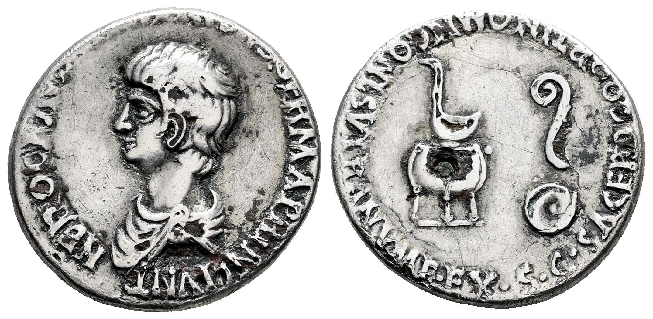 Nerón. Denario forrado. 50-54 d.C. Roma. (Ric-I 77). (Bmcre-87). (Tesorillo-Nerón 4, mismo ejemplar). Anv.: NERO CLAV(D CAES DRVSVS G)ERM PRINC IVVENT. Cabeza desnuda y busto drapeado a la izquierda. Rev.: SACERD COOPT IN OMN CONL SVPRA NVM EX S C. Simpulum sobre trípode a la izquierda, lituus sobre pátera a la derecha. Ae/Ag. 2,69 g. Ex J. Vico 120 (04/06/2009), lote 92. Conserva la etiqueta original. MBC. Est...120,00.