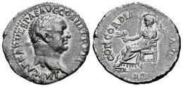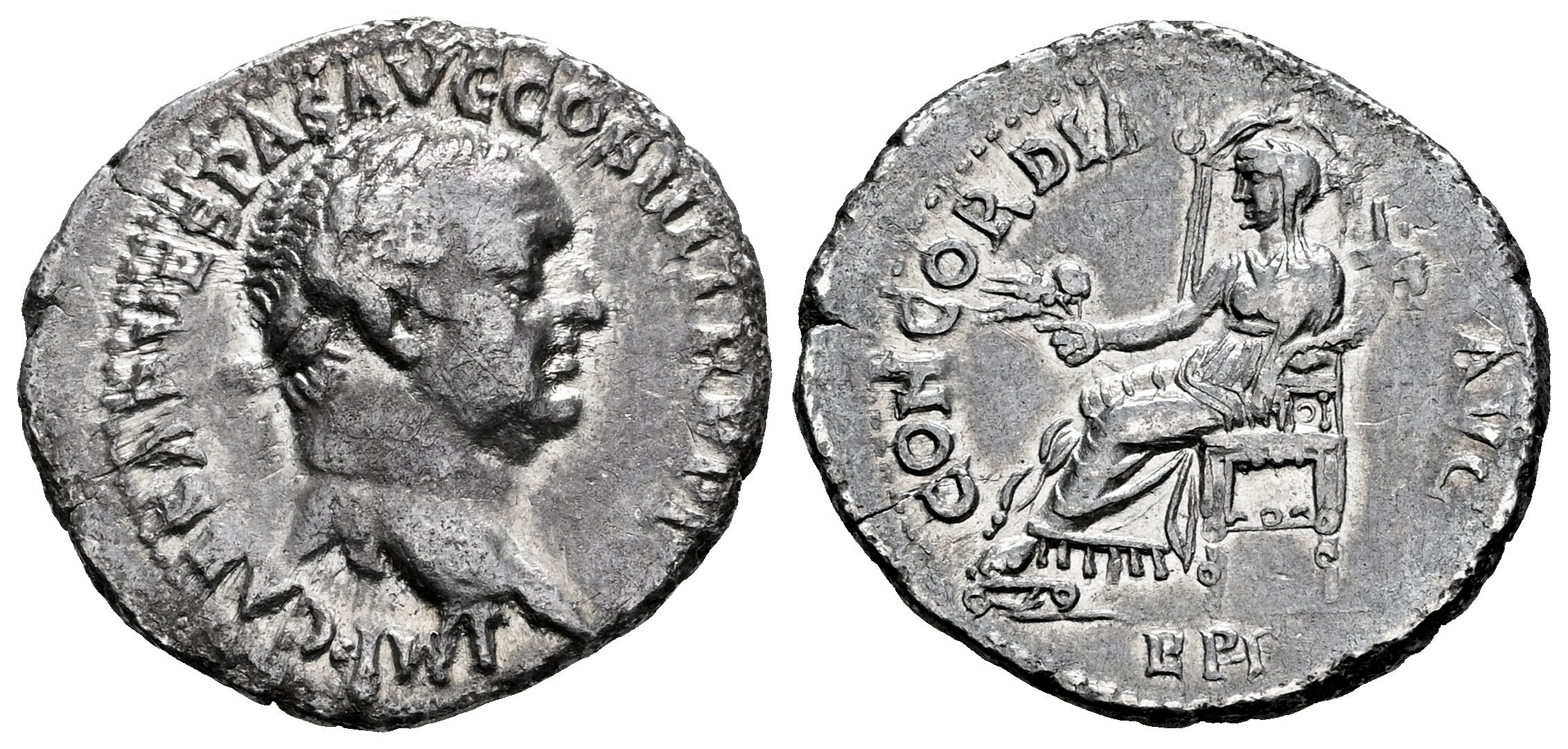 Vespasiano. Denario. 71 d.C. Ephesus. (Ric-II 1 1428). (Bmcre-453). (Tesorillo-Vespasiano 4, mismo ejemplar). Anv.: IMP CAESAR VESPAS AVG COS III TR P P P. Cabeza laureada a la derecha. Rev.: CONCORDIA AVG. Ceres sedente a la izquierda, en una silla decorada con respaldo alto, sosteniendo espigas, amapolas y cornucopia; EPHE (ligada) en exergo. Ag. 2,57 g. Restos de brillo original. Ex J. Vico 123 (17/06/2010), lote 3109. Conserva la etiqueta original. MBC+. Est...200,00.