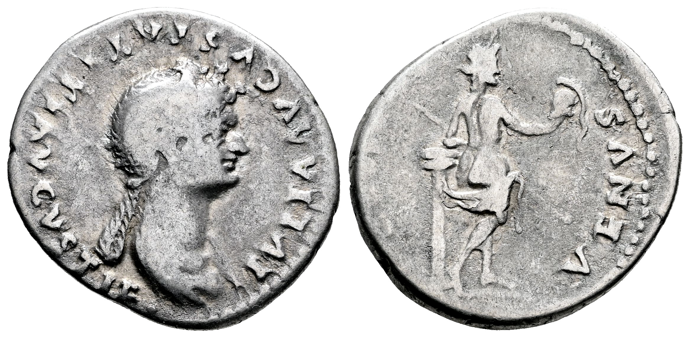 Julia Titi. Denario. 80-81 d.C. Roma. (Ric-II 1 388). (Bmcre-141). (Tesorillo-J. Titi 1, mismo ejemplar). Anv.: IVLIA AVGVSTA TITI AVGVSTI F•. Busto drapeado y diademado a derecha. Rev.: VENVS (AVGVST). Venus en pie a la derecha, apoyada sobre una columna, sosteniendo yelmo y lanza. Ag. 3,21 g. Rara. Ex Ancient Delights, actualmente Mayor 25. (Abril 2002). MBC-. Est...250,00.
