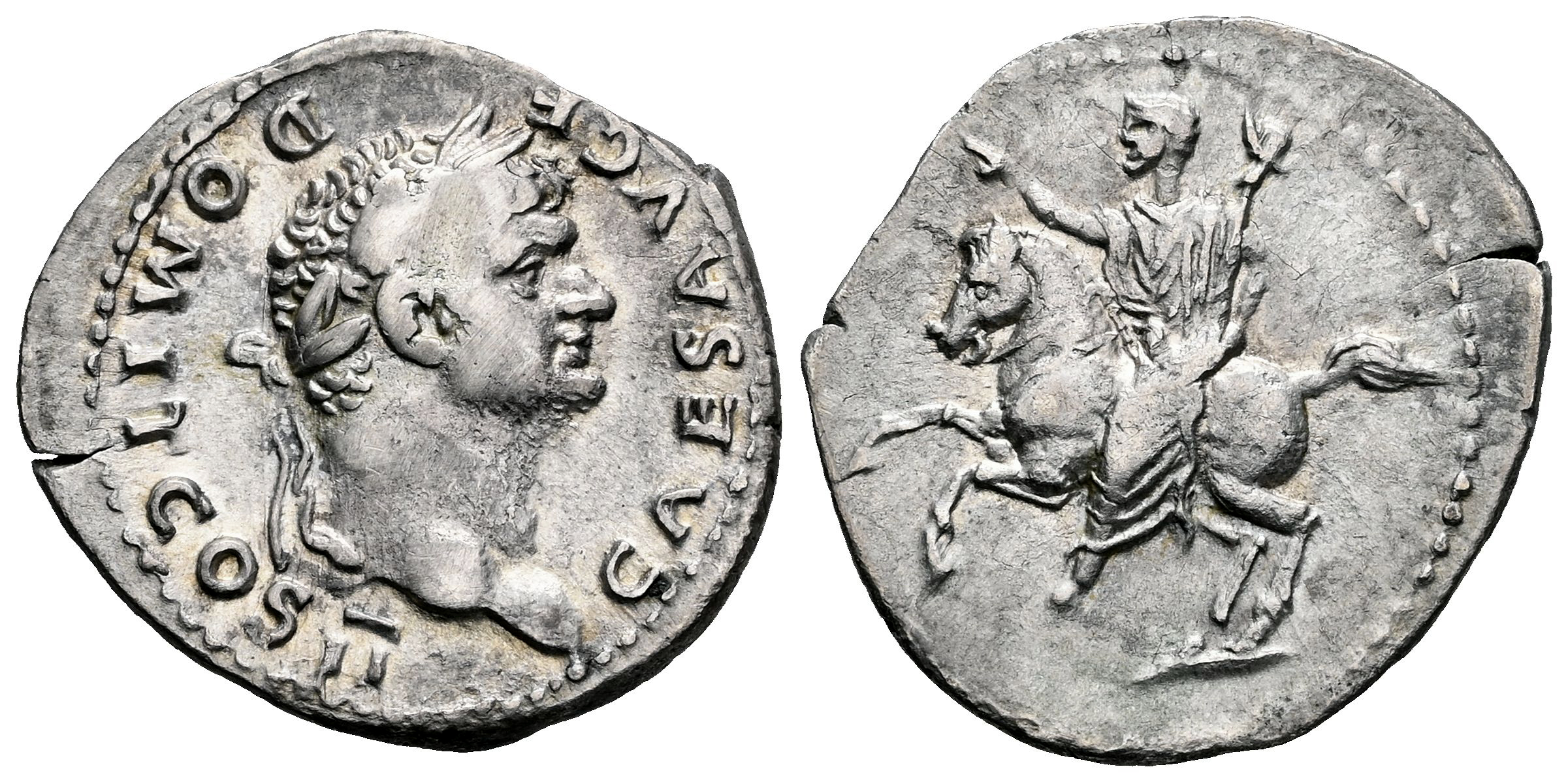Domiciano. Denario. 73-75 d.C. Roma. (Ric-II 1 680). (Bmcre-129). (Tesorillo-Domiciano 1, mismo ejemplar). Anv.: CAES AVG F DOMIT COS II. Cabeza laureada a la derecha. Rev.: Domiciano a caballo a la izquierda, levantando la mano derecha en señal de saludo y sosteniendo cetro. Ag. 3,13 g. Fallito de acuñación en anverso. Atractiva. Ex Ancient Imports, Vcoins (Noviembre 2007). MBC+/EBC-. Est...200,00.