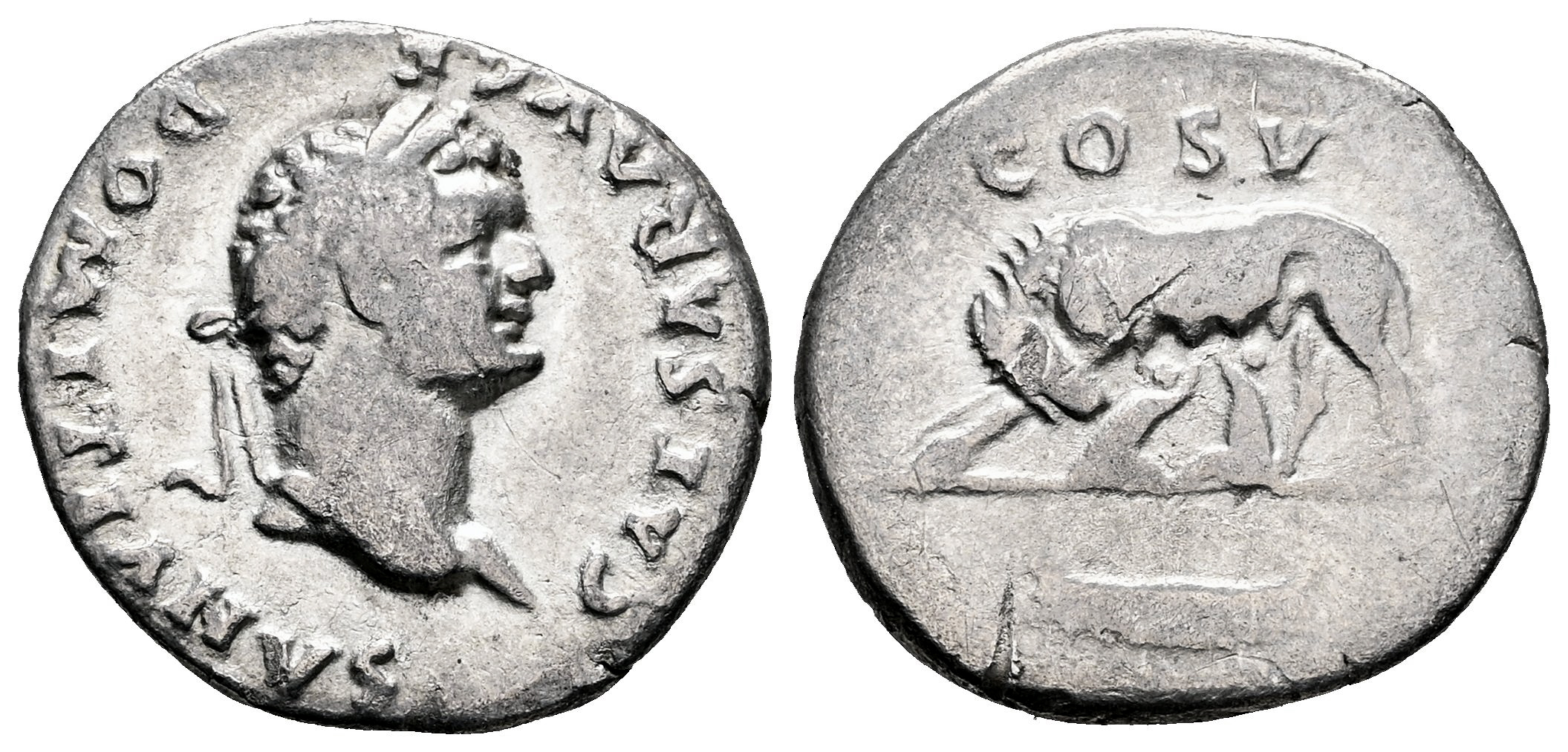 Domiciano. Denario. 77-78 d.C. Roma. (Ric-II 1 961). (Bmcre-241/2). (Tesorillo-Domiciano 3, mismo ejemplar). Anv.: CAESAR AVG F DOMITIANVS. Cabeza laureada a la derecha. Rev.: COS V. Loba a la izquierda, amamantando gemelos; barca en exergo. Ag. 2,91 g. Rayitas en reverso. Ex Ancient Delights, actualmente Mayor 25. (Diciembre 2002). MBC-. Est...100,00.