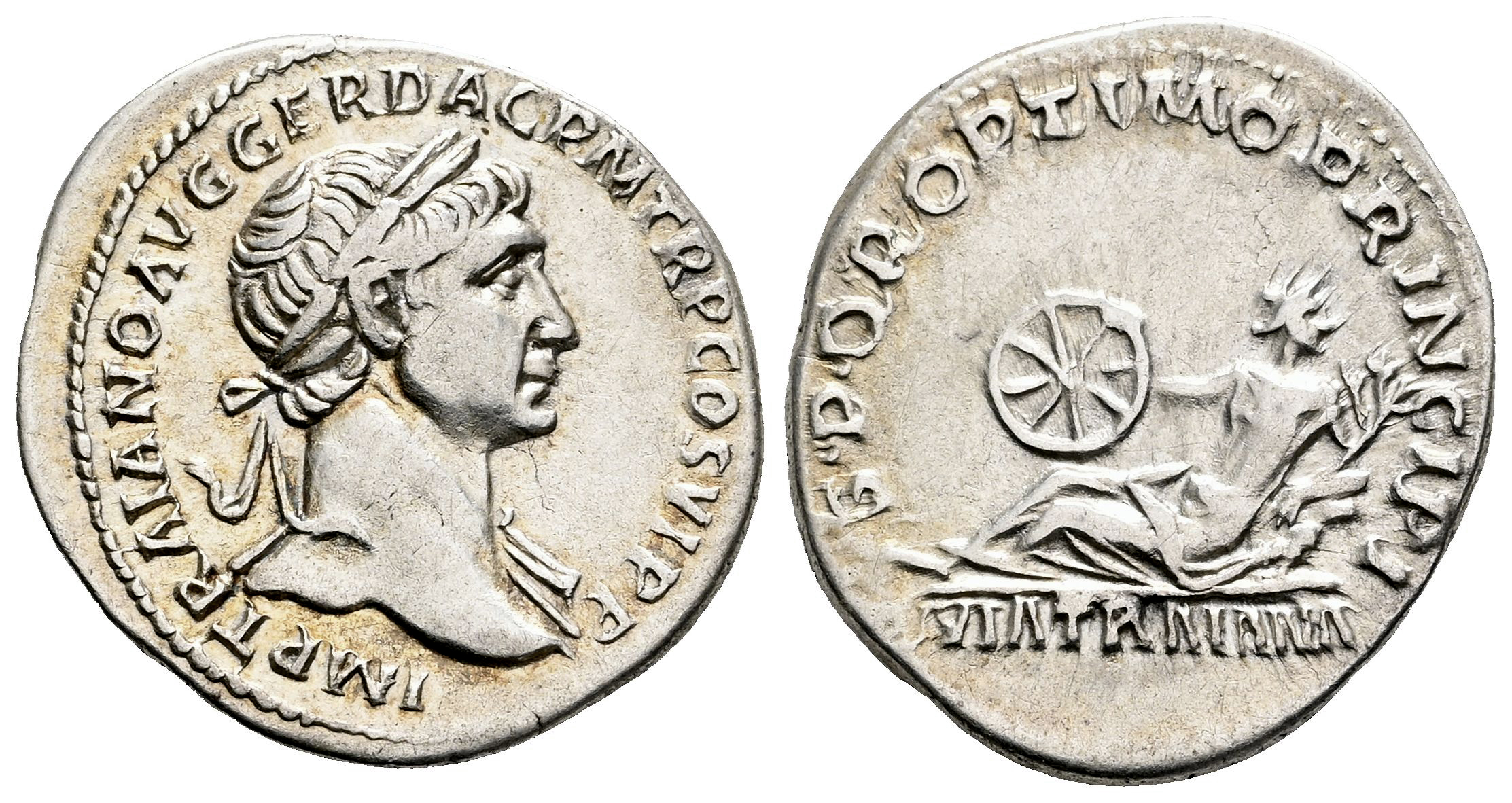 Trajano. Denario. 112-113 d.C. Roma. (Ric-266). (Woytek-398). (Tesorillo-Trajano 14, mismo ejemplar). Anv.: IMP TRAIANO AVG GER DAC P M TR P COS VI P P. Cabeza laureada a la derecha, ligero drapeado sobre el hombro opuesto. Rev.: S P Q R OPTIMO PRINCIPI. Personificación de Vía Traiana reclinada a la izquierda sobre rocas, con rueda y rama; VÍA TRAIANA en exergo. Ag. 3,39 g. Atractivo ejemplar. Ligero tono. Ex Rutten & Weiland, Vcoins (Enero 2010). EBC-. Est...250,00.