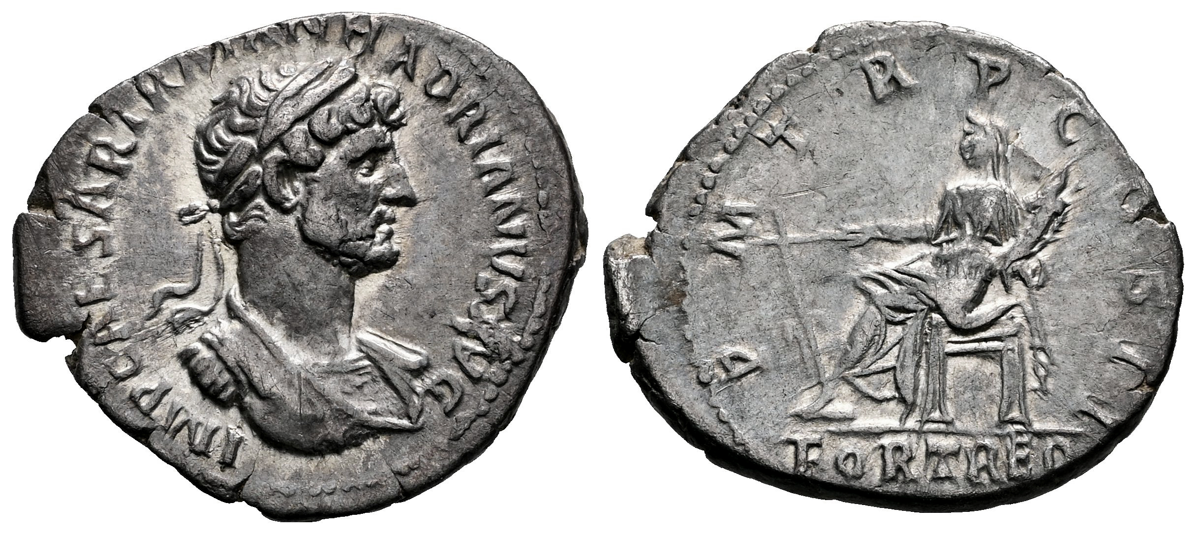 Adriano. Denario. 121-123 d.C. Roma. (Ric-II 41). (Rsc-745a). (Tesorillo-Adriano 5, mismo ejemplar). Anv.: IMP CAESAR TRAIAN HADRIANVS AVG. Busto laureado y drapeado de Adriano a la derecha. Rev.: P M TR P COS III. Fortuna, velada, sedente a la izquierda, sosteniendo el timón en la mano derecha y una cornucopia en la izquierda; FORT RED en el exergo.. Ag. 2,82 g. Rara. MBC+/MBC. Est...120,00.