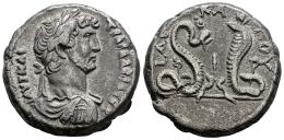 Adriano. Tetradracma. Año 10 = 125/6 d.C. Alejandría. Egipto. (Köln-894). (Emmett-804). (Tesorillo-Adriano 20, mismo ejemplar). Anv.: Busto laureado, drapeado y con coraza hacia la derecha. Rev.: Serpiente Agathodaemon enroscada alrededor de un caduceo erecto hacia la derecha frente a Uraeus erecto hacia la izquierda; LΔ (fecha) ΕΚΑΤΟV alrededor. Ve. 12,98 g. Rara. Atractivo ejemplar. MBC+. Est...250,00.