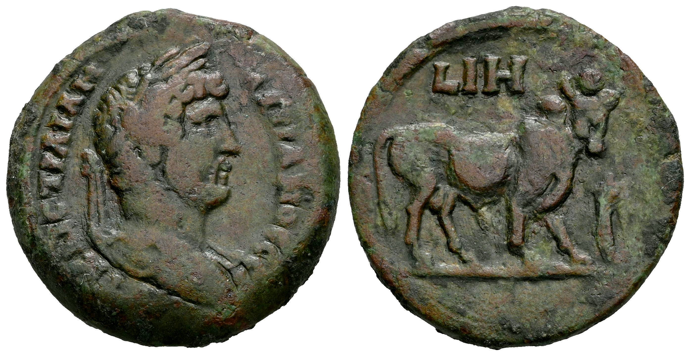 Adriano. Dióbolo. RY 18 = 133/4 d.C. Alejandría. Egipto. (RPC-III 5928). (Dattari (Savio)-1922). (Tesorillo-Adriano 29, mismo ejemplar). Anv.: ΑΥΤ ΚΑΙ ΤΡΑΙ ΑΔΡΙΑ ϹЄΒ. Busto laureado, drapeado y con coraza a la derecha. Rev.: Toro Apis, creciente en el costado y disco solar entre los cuernos, en pie a la derecha, altar a la derecha; L ΙΗ (fecha) arriba. Ae. MBC-/MBC. Est...90,00.
