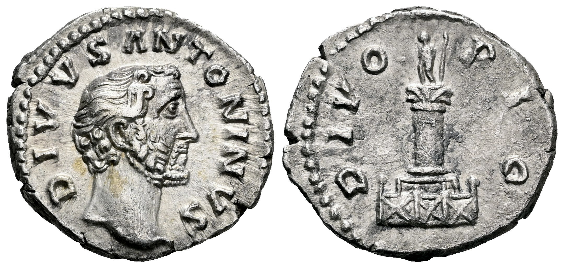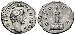Divo Antonino Pío. Denario. 161-162 d.C. Roma. (Ric-439). (Bmc-67). (Tesorillo-A. Pío 10, mismo ejemplar). Anv.: DIVVS ANTONINV.S Cabeza desnuda a la derecha. Rev.: DIVO PIO. Columna de Antonino Pío: una columna alta, sobre una base rodeada por una balaustrada, coronada por una estatua del emperador deificado. Ag. 3,01 g. Ex Barry Murphy, Vcoins (Febrero 2009). EBC-/MBC+. Est...160,00.
