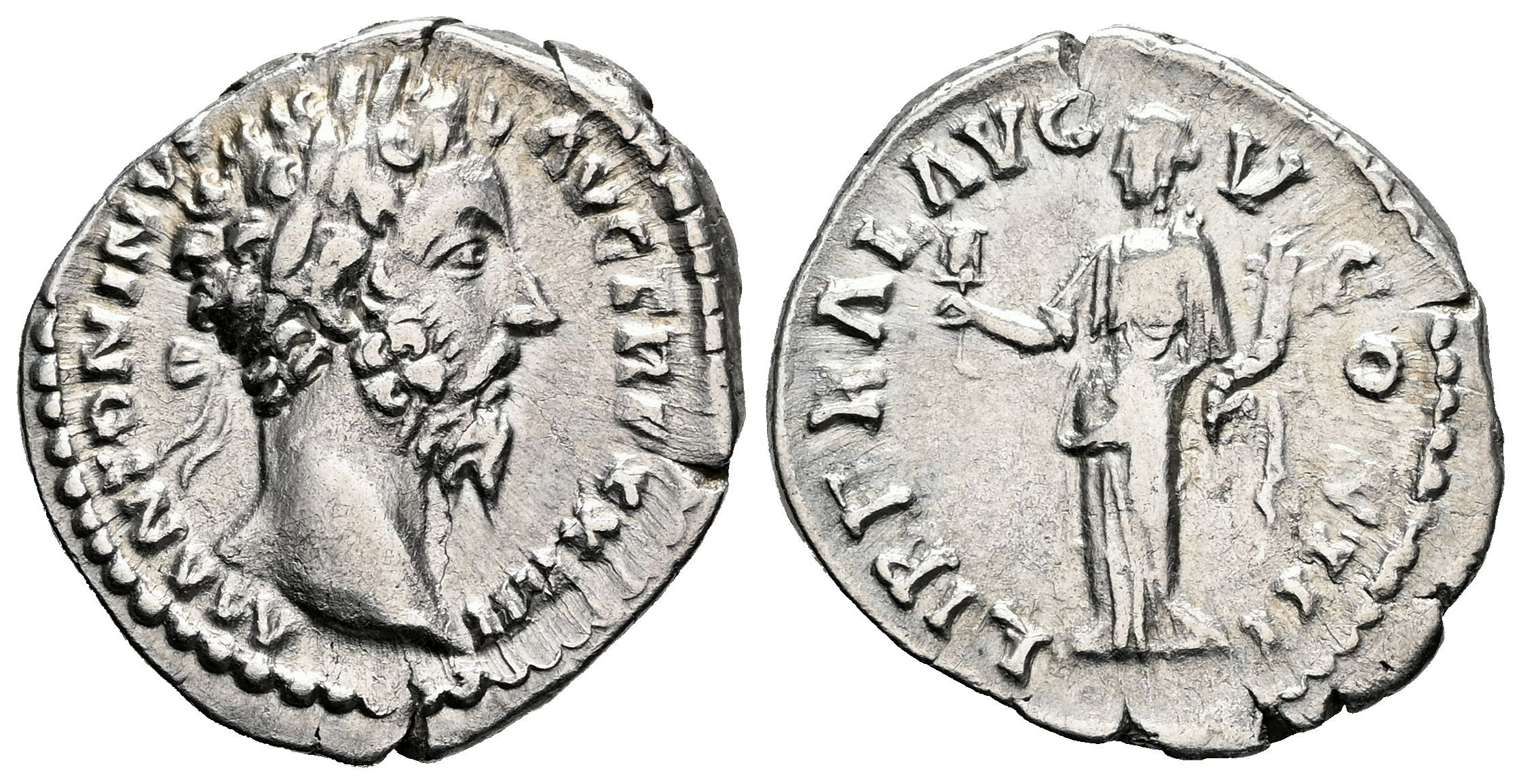Marco Aurelio. Denario. 169-170 d.C. Roma. (Ric-221). (Cohen-413). (Tesorillo-M. Aurelio 17, mismo ejemplar). Anv.: M ANTONINVS AVG TR P XXIIII. Cabeza laureada a la derecha. Rev.: LIBERAL AVG V COS III. Liberalitas en pie a la izquierda, sosteniendo un ábaco con la mano derecha extendida y una cornucopia con la izquierda. Ag. 3,33 g. MBC+/MBC. Est...120,00.