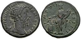 Marco Aurelio. Dupondio. 175 d.C. Roma. (Ric-III 1134). (MIR-18. 295-8/50). (Tesorillo-M. Aurelio 4, mismo ejemplar). Anv.: M ANTONINVS AVG GERM TR P XXIX. Cabeza radiada a la derecha. Rev.: IMP VII COS III, Annona en pie a la izquierda, sosteniendo espigas sobre modio a sus pies y cornucopia; S-C a través de los campos. Ae. 10,75 g. Ex Aeternitas Numismatics (Febrero 2012). MBC. Est...100,00.