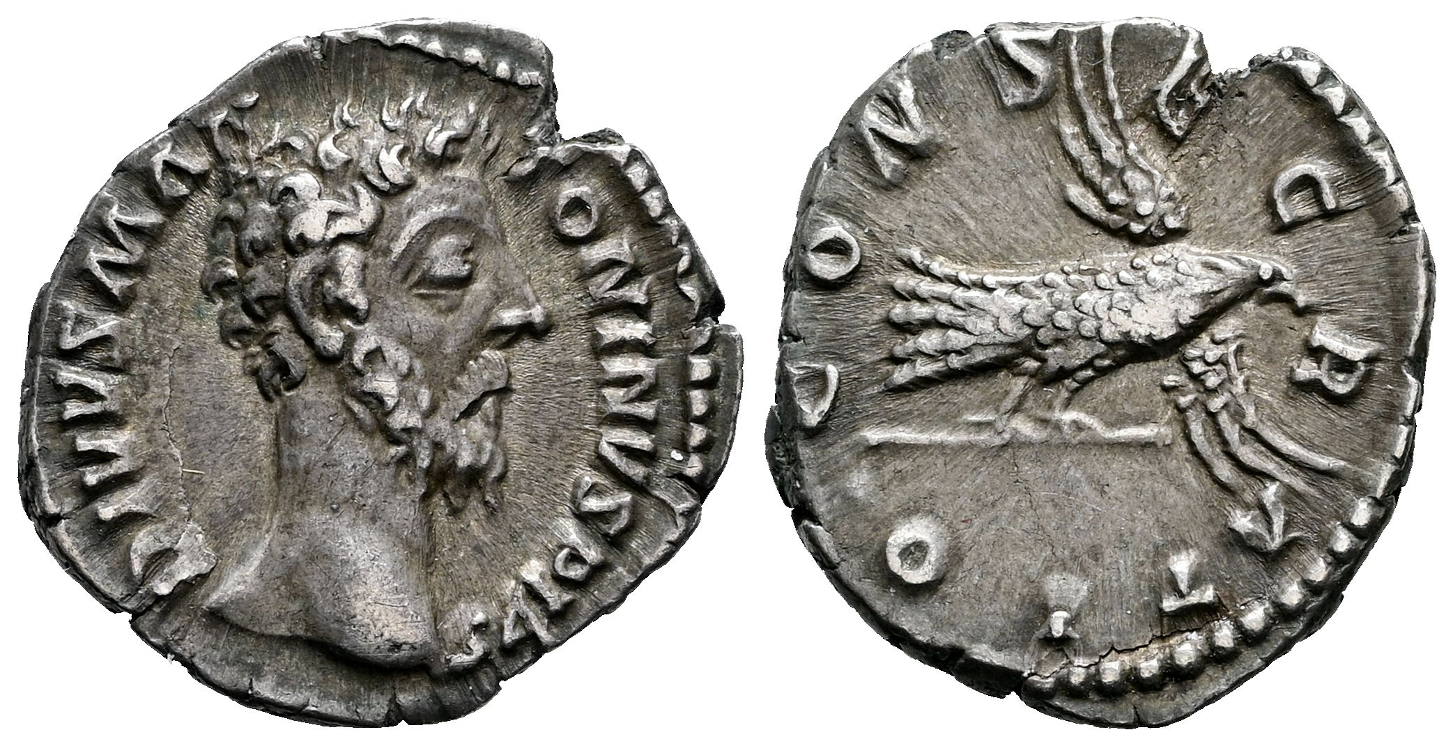 Divo Marco Aurelio. Denario. 170-171 d.C. Roma. (Ric-III 268). (Cohen-81). (Tesorillo-M. Aurelio 12, mismo ejemplar). Anv.: DIVVS M ANTONINVS PIVS. Cabeza desnuda a la derecha. Rev.: CONSECRATIO. Águila volando a la derecha, sosteniendo un cetro entre sus garras.. Ag. 3,05 g. Suave pátina. Ex Zuzim Inc. (Julio 2007). MBC+. Est...160,00.