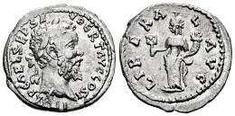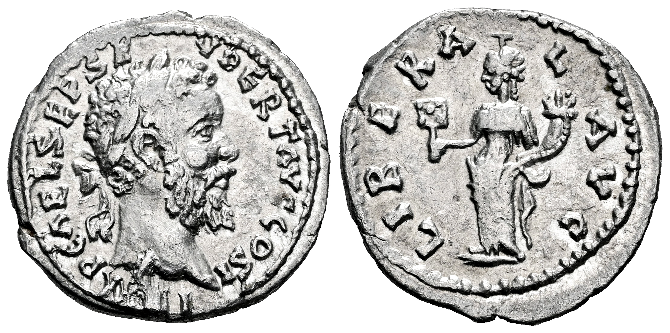 Septimio Severo. Denario. 164-165 d.C. Emesa. (Ric-400). (Cohen-283 corr.). (Tesorillo-Sep. Severo 11, mismo ejemplar). Anv.: IMP CAE L SEP SEV PERT AVG COS II. Cabeza laureada a la derecha. Rev.: LIBERAL AVG. Liberalitas en pie de frente, mirando a la izquierda, sosteniendo ábaco en la mano derecha y una cornucopia en la izquierda. Ag. 2,16 g. Ex Ancient Delights, actualmente Mayor 25. (Junio 2002). MBC+. Est...100,00.