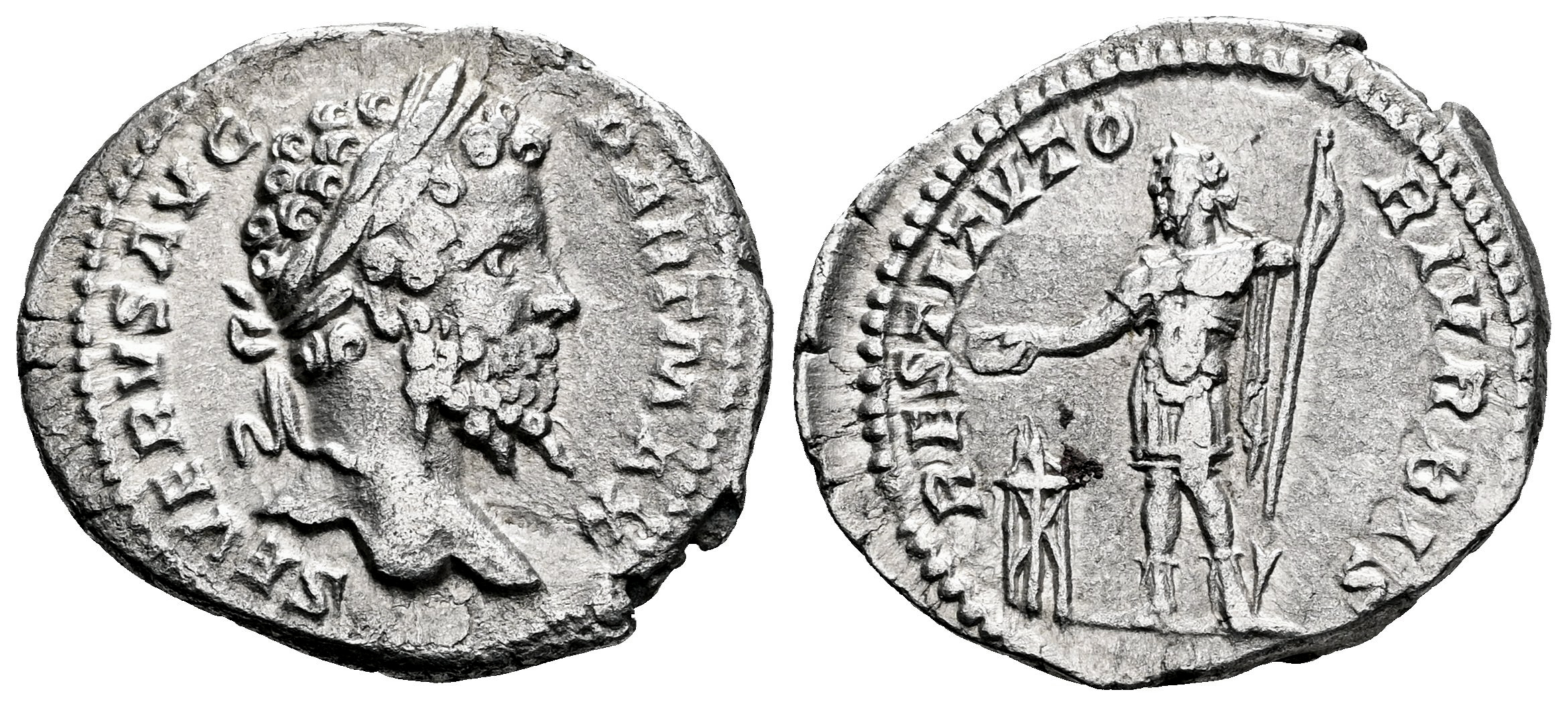 Septimio Severo. Denario. 200-201 d.C. Roma. (Ric-IV 168a). (Rsc-612). (Tesorillo-Sep. Severo 32, mismo ejemplar). Anv.: SEVERVS AVG PART MAX. cabeza laureada a la derecha. Rev.: RESTITVTORI VRBIS. Emperador en pie a la izquierda, sosteniendo patera sobre altar en trípode y lanza . Ag. 3,15 g. MBC. Est...80,00.
