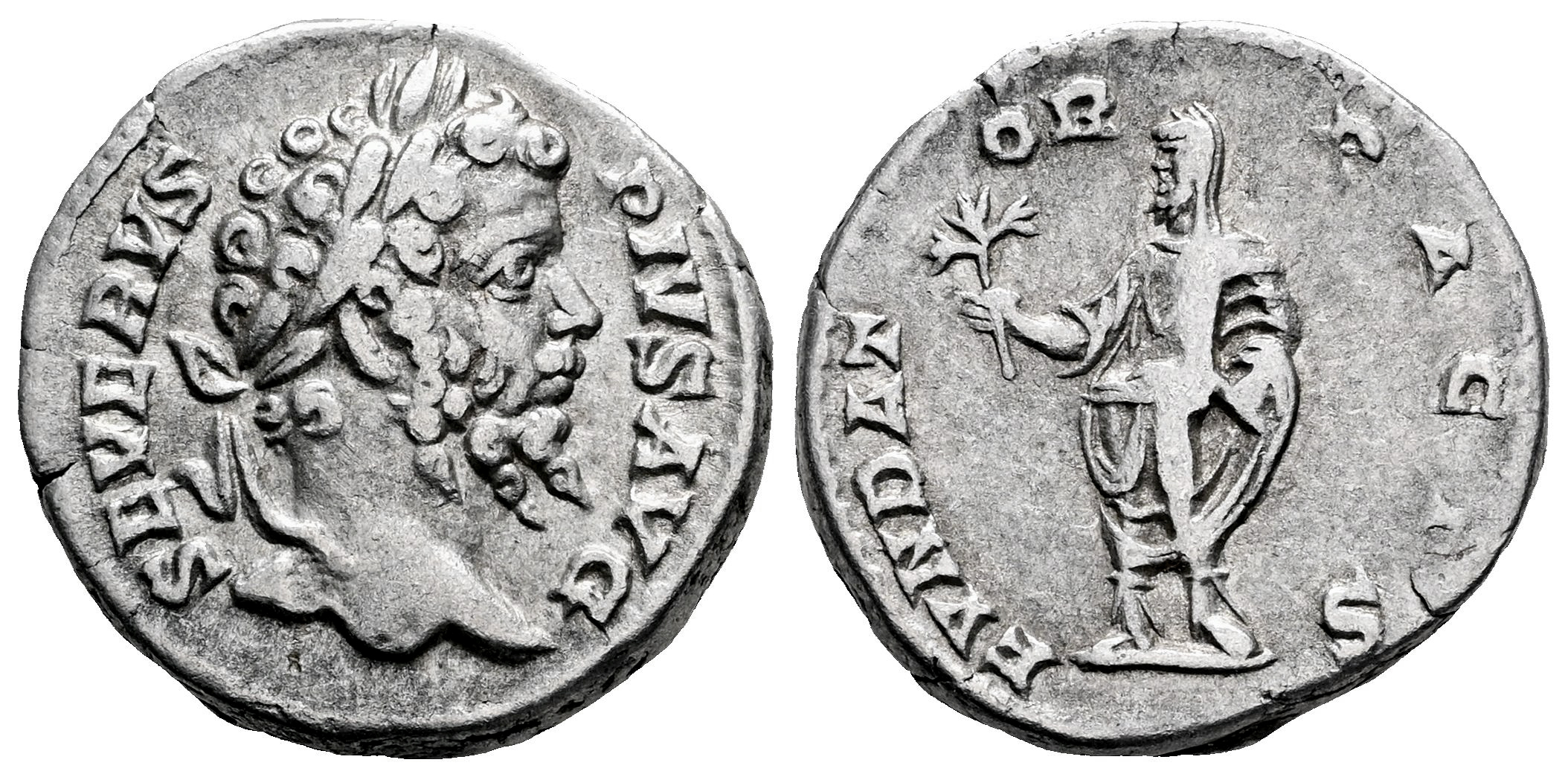 Septimio Severo. Denario. 202-210 d.C. Roma. (Ric-IV 265). (Bmcre-330). (Tesorillo-Sep. Severo 9, mismo ejemplar). Anv.: SEVERVS PIVS AVG. Cabeza laureada a la derecha. Rev.: FVNDATOR PACIS. Emperador, con velo y toga, en pie a la izquierda, sosteniendo rama y rollo. Ag. 3,51 g. Ex Ancient Delights, actualmente Mayor 25. Convención de Madrid (Abril 2005). MBC+/MBC. Est...80,00.