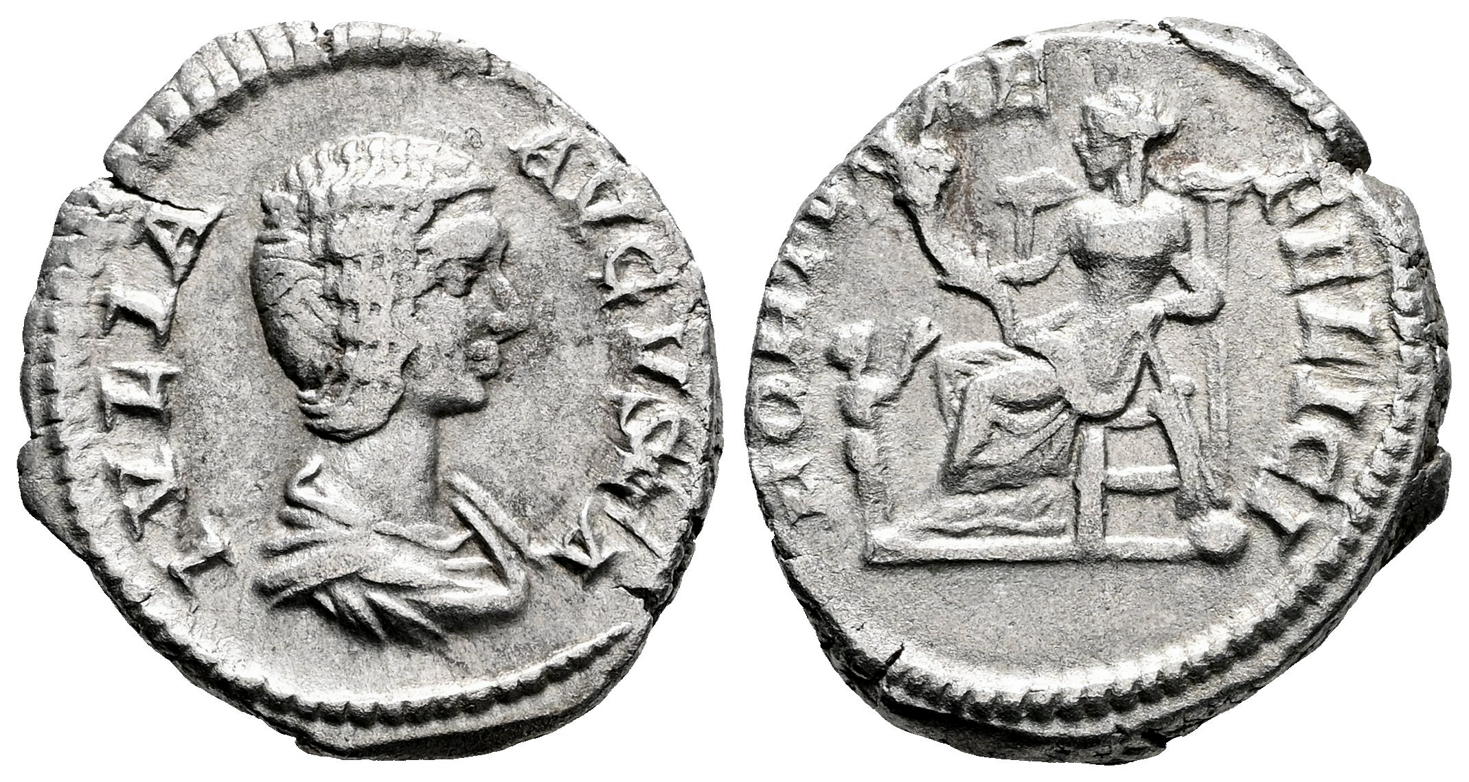 Julia Domna. Denario. 196-211 d.C. Roma. (Ric-IV 554). (Bmcre-29). (Tesorillo-J. Domna 4, mismo ejemplar). Anv.: IVLIA AVGVSTA. Busto drapeado a la derecha. Rev.: FORTVNAE FELICI. Fortuna sedente a la izquierda, sosteniendo una cornucopia y un timón sobre un globo, con un niño delante de ella. Ag. 3,51 g. Ex Ancient Delights, actualmente Mayor 25. Convención de Madrid (Abril 2005). MBC. Est...80,00.