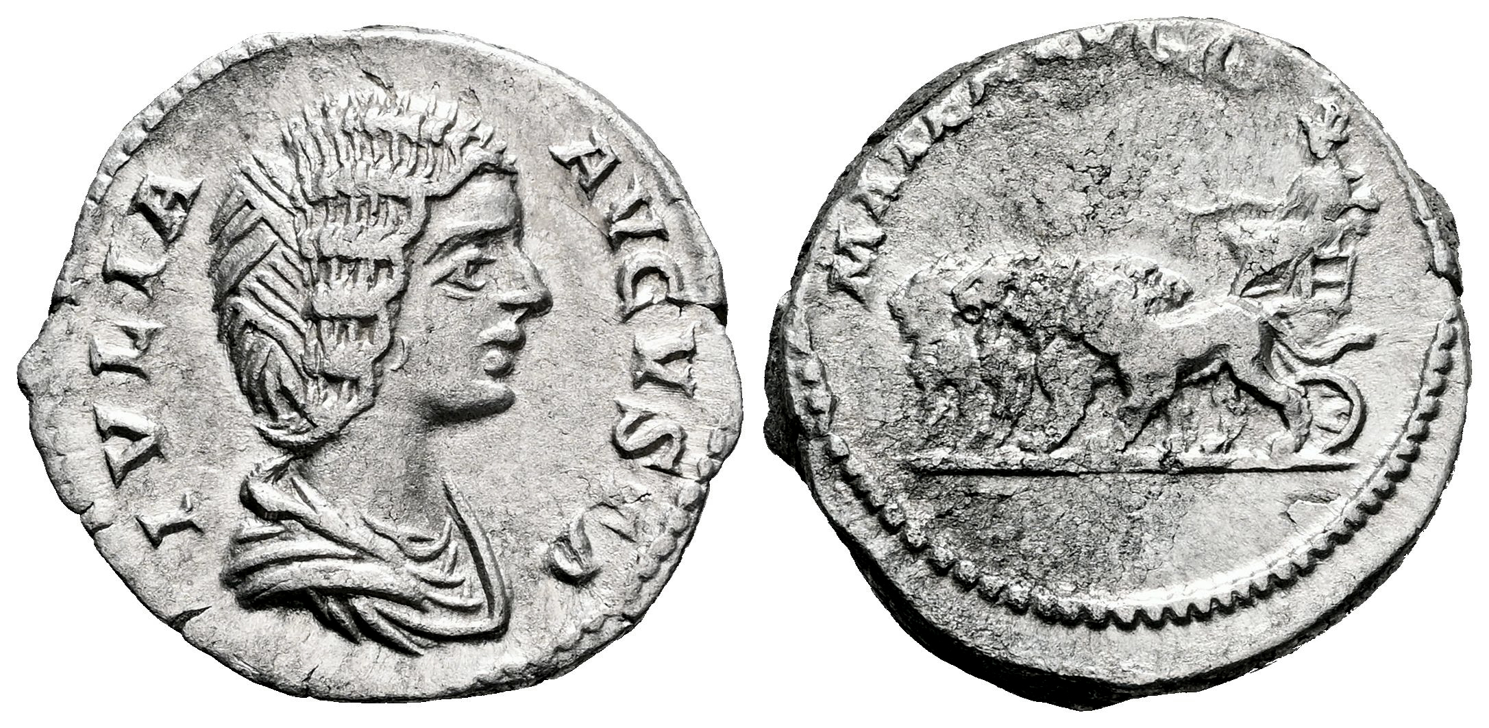 Julia Domna. Denario. 196-211 d.C. Roma. (Ric-IV 562). (Bmcre-48). (Tesorillo-J. Domna 8, mismo ejemplar). Anv.: IVLIA AVGVSTA. Busto drapeado a la derecha. Rev.: MATER AVGG. Julia Domna, con corona mural (como Cibeles), guiando una cuadriga de leones a la izquierda, sosteniendo una rama. Ag. 3,38 g. Ex Ancient Delights, actualmente Mayor 25. Convención de Madrid (Febrero 2006). EBC-/MBC+. Est...120,00.