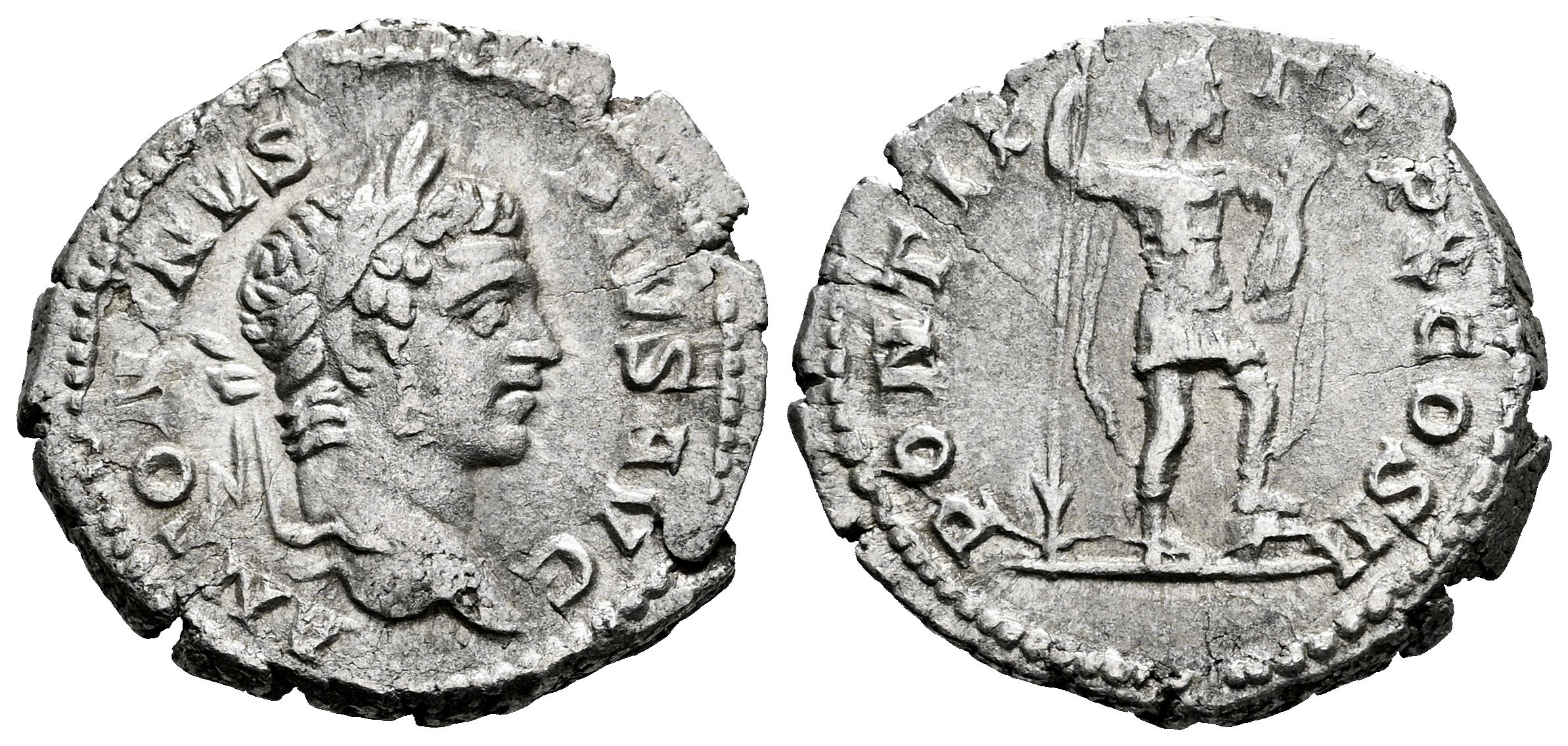 Caracalla. Denario. 207 d.C. Roma. (Ric-IV 95). (Bmcre-552). (Tesorillo-Caracalla 25, mismo ejemplar). Anv.: ANTONINVS PIVS AVG. Busto laureado a la derecha. Rev.: PONTIF TR P X COS II. Emperador en pie a la derecha, pie sobre casco o globo, sosteniendo lanza y parazonium. Ag. 3,57 g. Ex Ancient Delights, actualmente Mayor 25. Convención de Madrid (Enero 2005). MBC. Est...85,00.