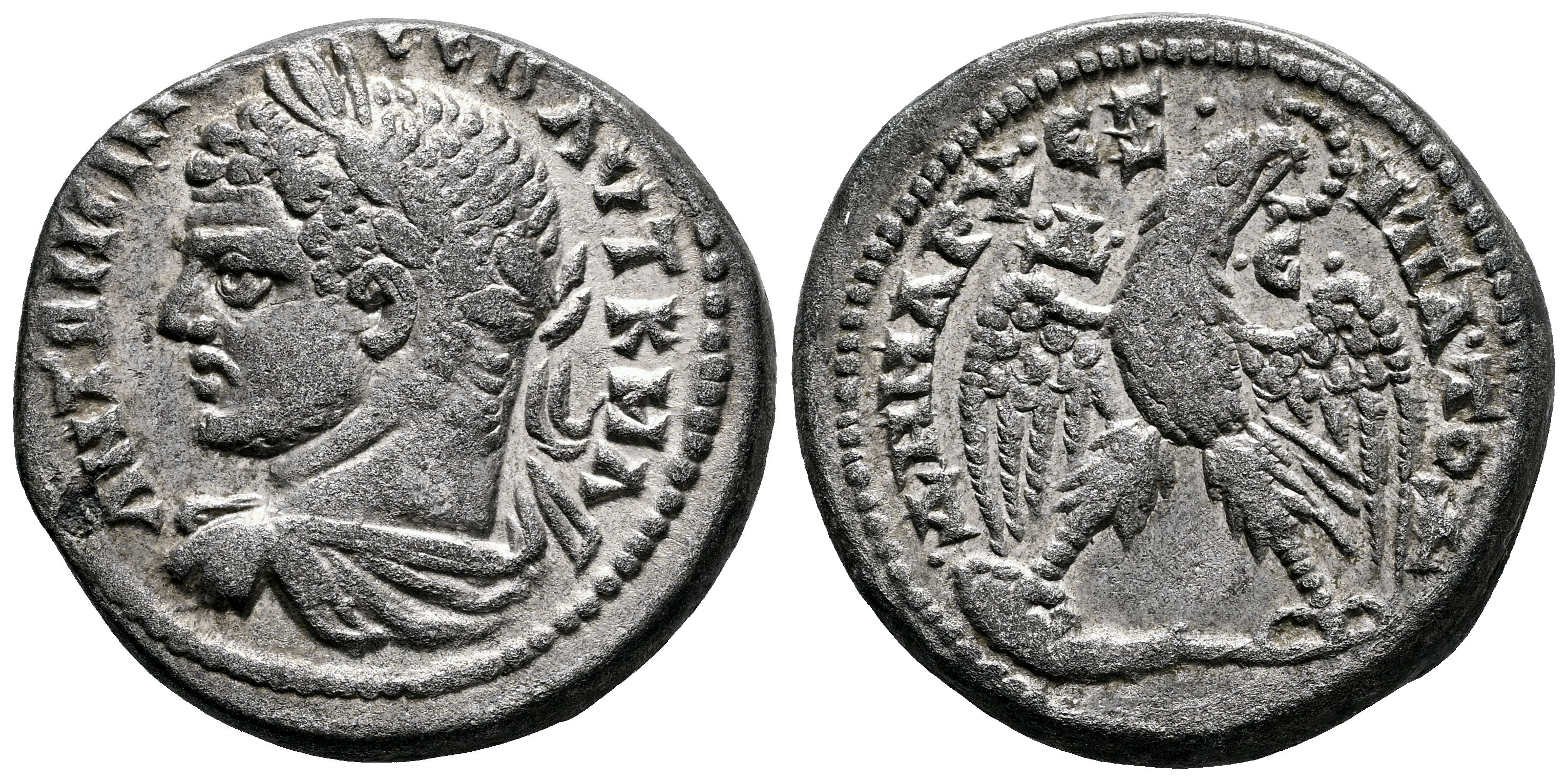 Caracalla. Seleucis y Pieria. Tetradracma. 215-217 d.C. Antioquía. (McAlee-682). (Prieur-228). (Tesorillo-Caracalla 36, mismo ejemplar). Anv.: ANTΩNЄIN(O)C CЄ AYT K M A. Busto laureado, drapeado y con coraza a la izquierda, visto desde atrás. Rev.: ·ΔHMAPX·ЄΞ·VΠA·TO Δ. Águila en pie de frente sobre pata con muslo de animal sacrificado, mirando a la derecha, con corona en el pico; •Δ•/•E• en los campos superiores. Ag. 13,45 g. Ex Cayón (16/09/2011), lote 3229. Conserva la etiqueta original. MBC. Est...150,00.