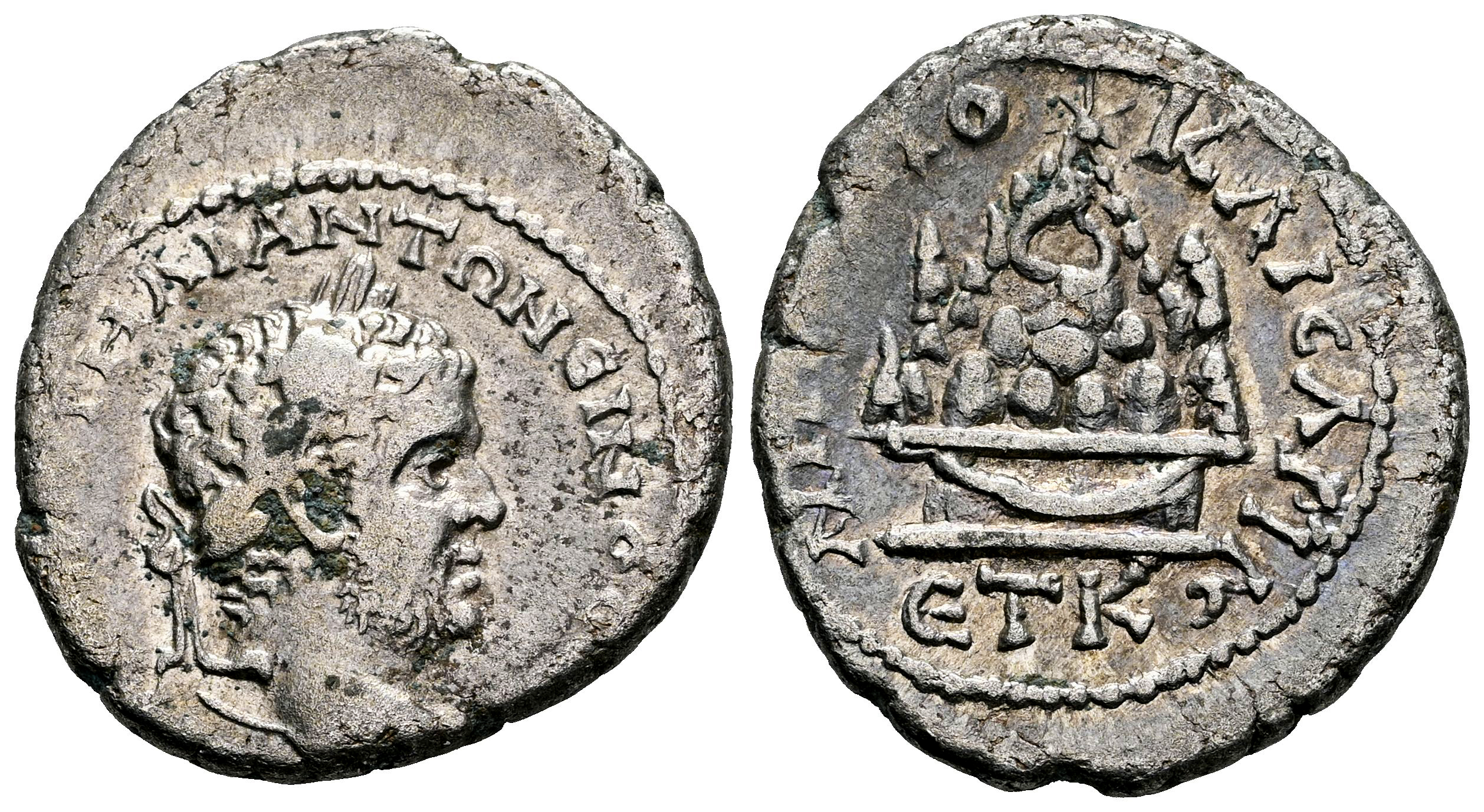 Caracalla. Didracma. Año 20 = 217 d.C. Caesarea. Cappadocia. (Bmc-270). (Tesorillo-Caracalla 39, mismo ejemplar). Anv.: (AYK M AY)PHΛI ANTΩNЄINOC (CEB Λ). Cabeza laureada y barbada a la derecha. Rev.: MH (ΓPOΠ)O KAICAPIAC. Monte Argeo colocado en un altar con guirnalda; estrella en la cima, ЄTK en exergo. Ag. 5,39 g. Ex J. Vico 133 (15/11/2012), lote 4263. Conserva la etiqueta original. MBC/MBC+. Est...120,00.