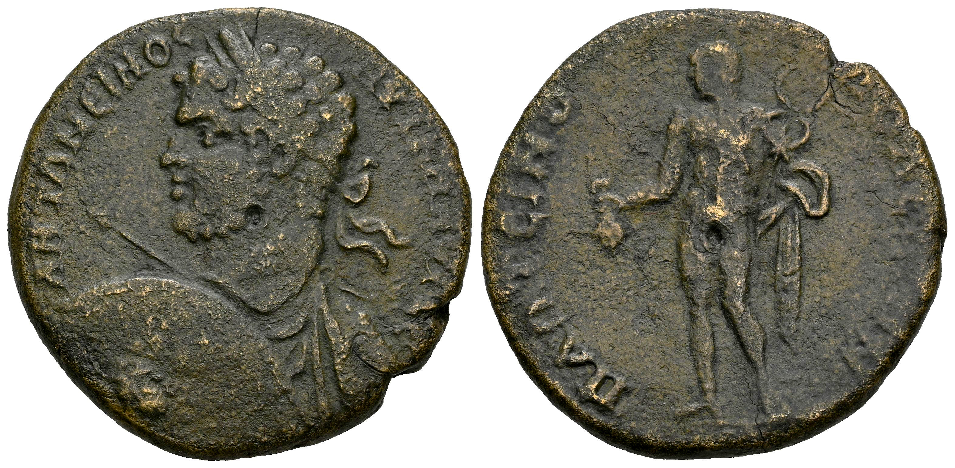 Caracalla. Tracia. AE 27. 211-217 d.C. Plotinopolis. (Varbanov-vgl. 4240, Vs. stgl.). (Tesorillo-Caracalla 44, mismo ejemplar). Anv.: ΑΝΤΩΝЄΙΝΟϹ ΑΥΤ Κ Μ ΑΥΡ ϹЄ. Busto laureado, drapeado y con coraza a la izquierda, sosteniendo una lanza y un escudo decorado. Rev.: ΠΛΩΤЄΙΝΟΠΟΛЄΙΤΩΝ. Hermes desnudo en pie a la izquierda, llevando a Kerykeion y bolsa. Ae. 9,82 g. Rara. Solo un ejemplar en Acsearch. MBC-. Est...100,00.