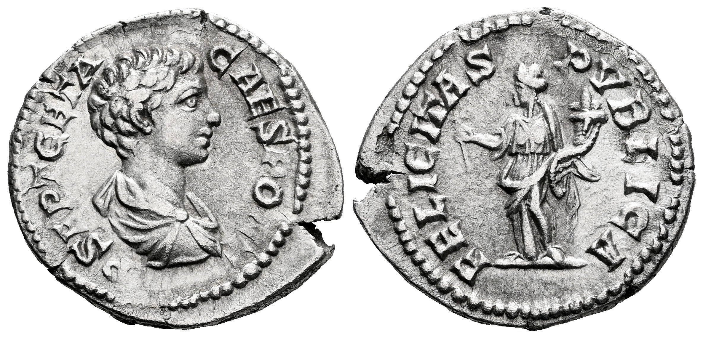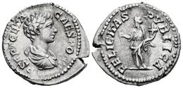 Geta. Denario. 200-202 d.C. Roma. (Ric-IV 9a). (Bmcre-220). (Tesorillo-Geta 3, mismo ejemplar). Anv.: P SEPT GETA CAES PONT. Busto drapeado a derecha. Rev.: FELICITAS PVBLICA. Felicitas en pie a izquierda, sosteniendo caduceo y cornucopias . Ag. 2,95 g. Ex Ancient Delights, actualmente Mayor 25. Convención de Madrid (Abril 2005). MBC+. Est...90,00.