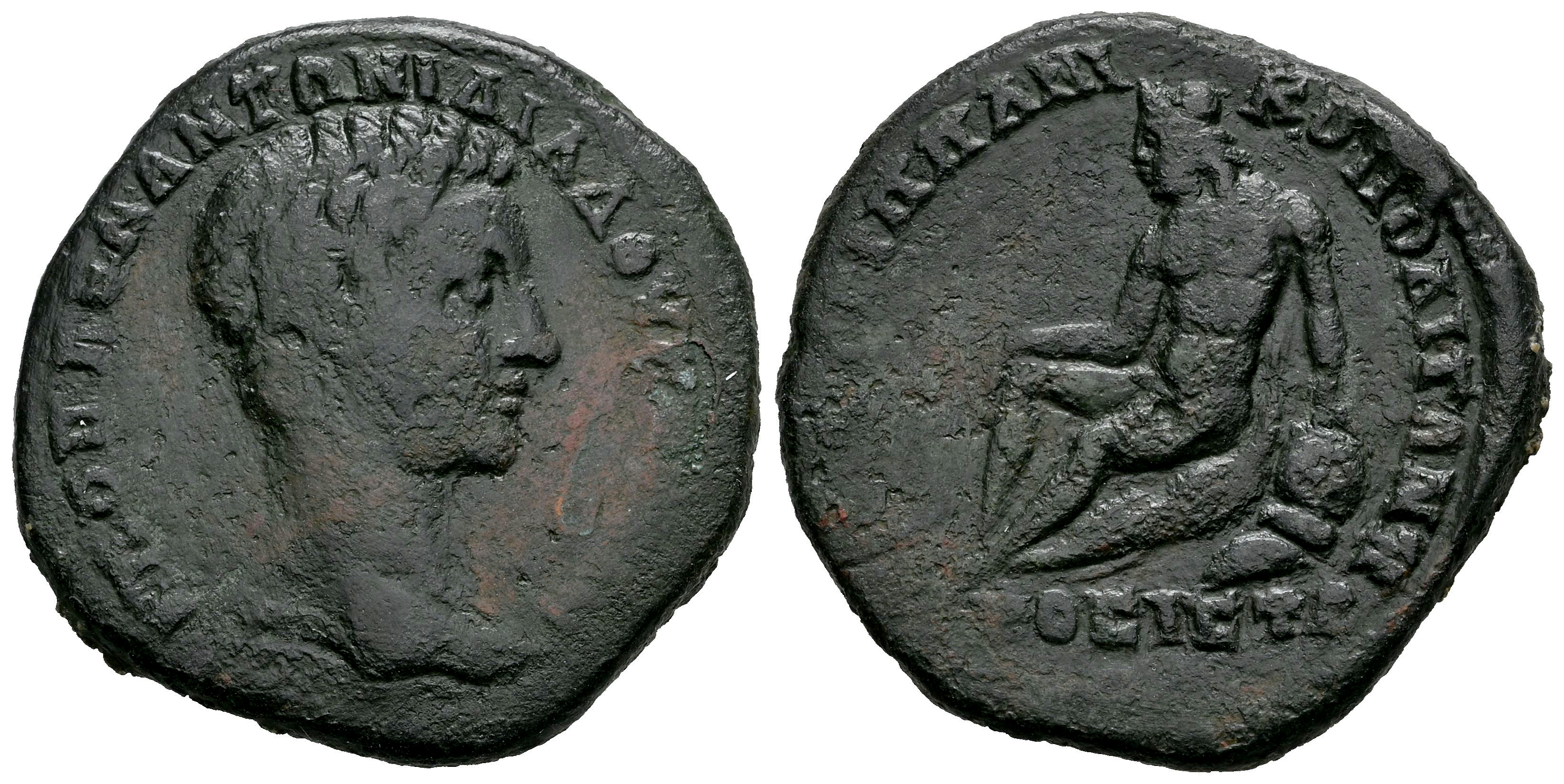 Diadumeniano. Moesia Inferior. AE 28. 217-218 d.C. Nicopolis e Istrum. Legado consular, Marcus Claudius Agrippa. (AMNG-I 1806). (Varbanov-3633). (Tesorillo-Diadumeniano 3, mismo ejemplar). Anv.: K M OΠΠEΛ ANTΩNIN ΔIAΔOV(MENIANOC). Cabeza desnuda derecha. Rev.: (VΠ AΓ)PIΠΠA NIKOΠOΛITΩN Π-POC ICTΓ. El dios del río Danubio sedente a la izquierda, la mano derecha sobre la rodilla y la izquierda apoyada sobre una urna volcada. Ae. 11,74 g. MBC-. Est...100,00.