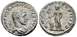 Eliogábalo. Denario. 221 d.C. Roma. (Ric-IV 46). (Bmcre-256). (Tesorillo-Heliogábalo 13, mismo ejemplar). Anv.: IMP ANTONINVS PIVS AVG. Busto laureado y drapeado a la derecha, con 'cuerno'. Rev.: P M TR P IIII COS III P P. Emperador en pie a la izquierda, sacrificando sobre un altar en llamas, sosteniendo pátera y rama (o garrote); estrella a la izquierda. Ag. 3,11 g. Leves restos de brillo original. Ex Ancient Delights, actualmente Mayor 25. Convención de Madrid (Septiembre 2004). MBC+/EBC. Est...100,00.