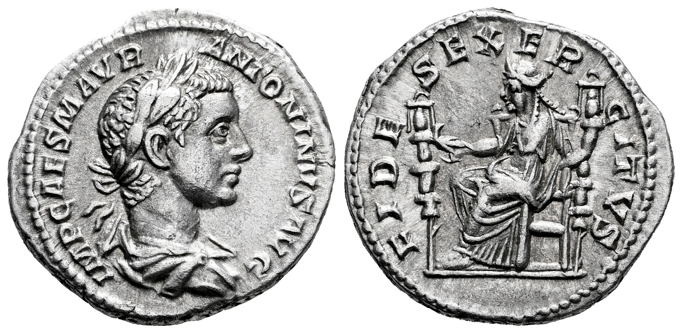 Eliogábalo. Denario. 218 d.C. Roma. (Ric-IV 71). (Bmcre-15). (Tesorillo-Heliogábalo 6, mismo ejemplar). Anv.: IMP CAES M AVR ANTONINVS AVG. Busto laureado y drapeado a la derecha. Rev.: FIDES EXERCITVS. Fides sedente a la izquierda, sosteniendo águila y estandarte, otro estandarte delante. Ag. 3,33 g. Ex Ancient Delights, actualmente Mayor 25. Convención de Madrid (Diciembre 2005). EBC-. Est...100,00.